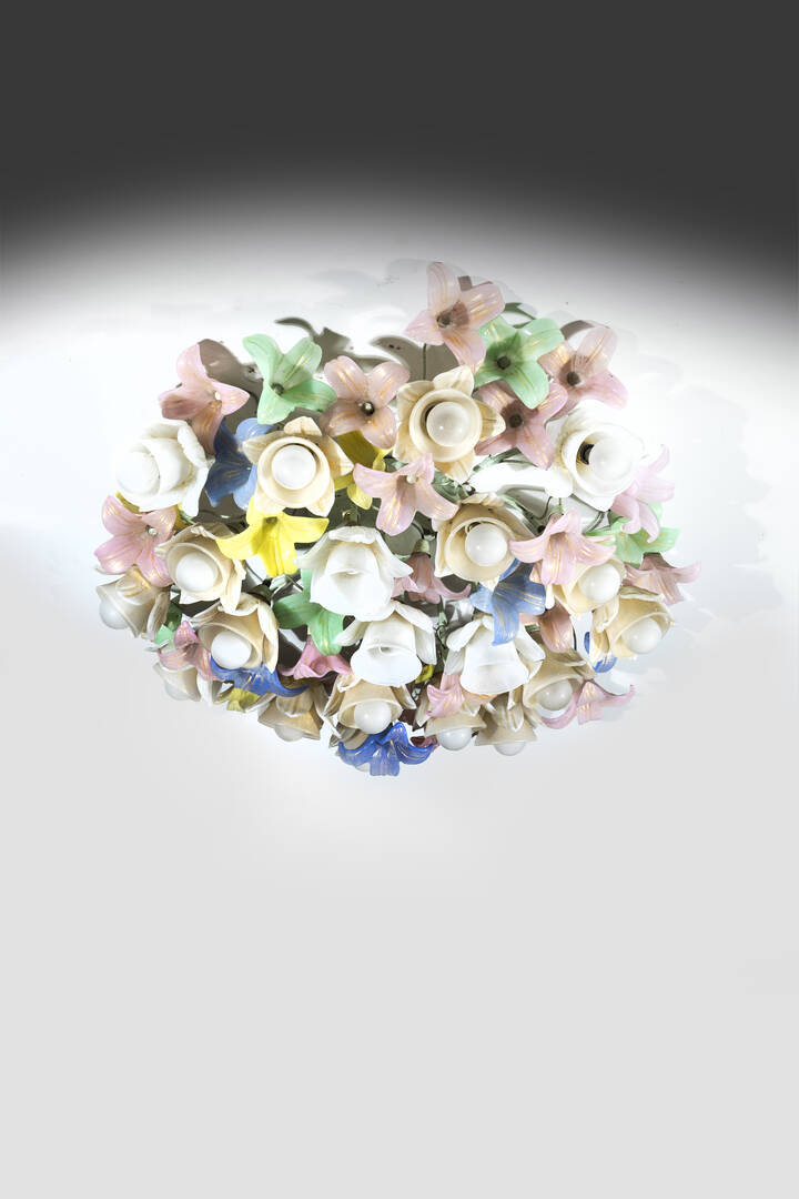 Struttura in metallo verniciato ed elementi floreali in vetro colorato con inclusioni in foglia d'oro.