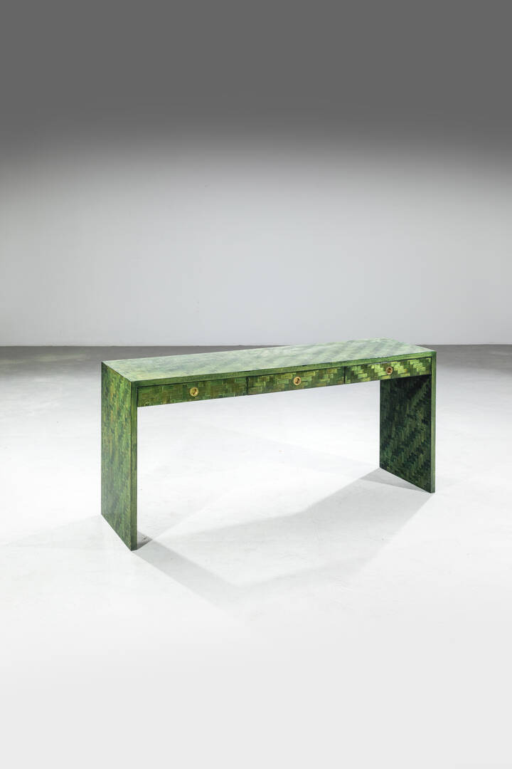 Struttura in legno, rivestimento in legno di varie essenze e particolari in ottone.