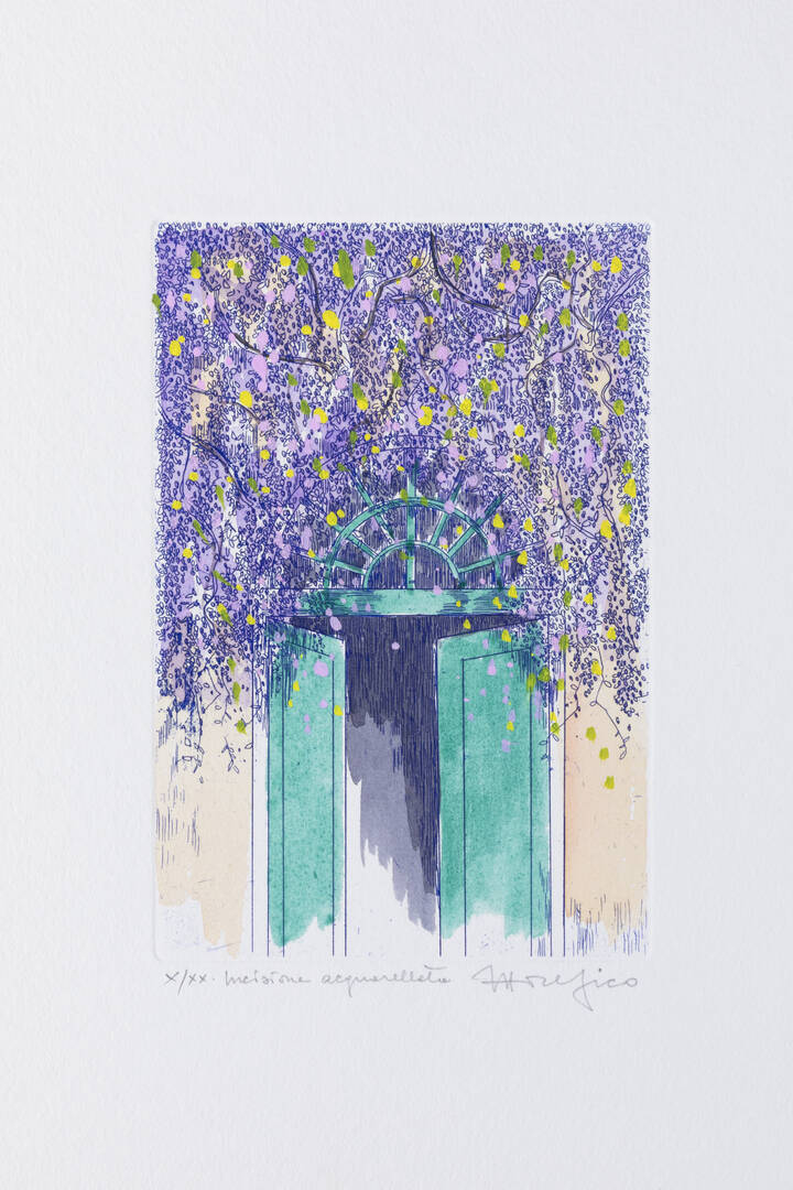 Opera firmata in basso a destra, numerata in basso a sinistra e iscritta "incisione acquarellata" in basso al centro (a matita sul foglio)