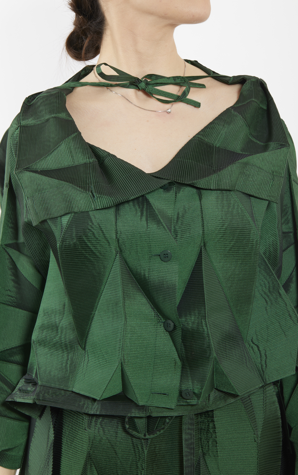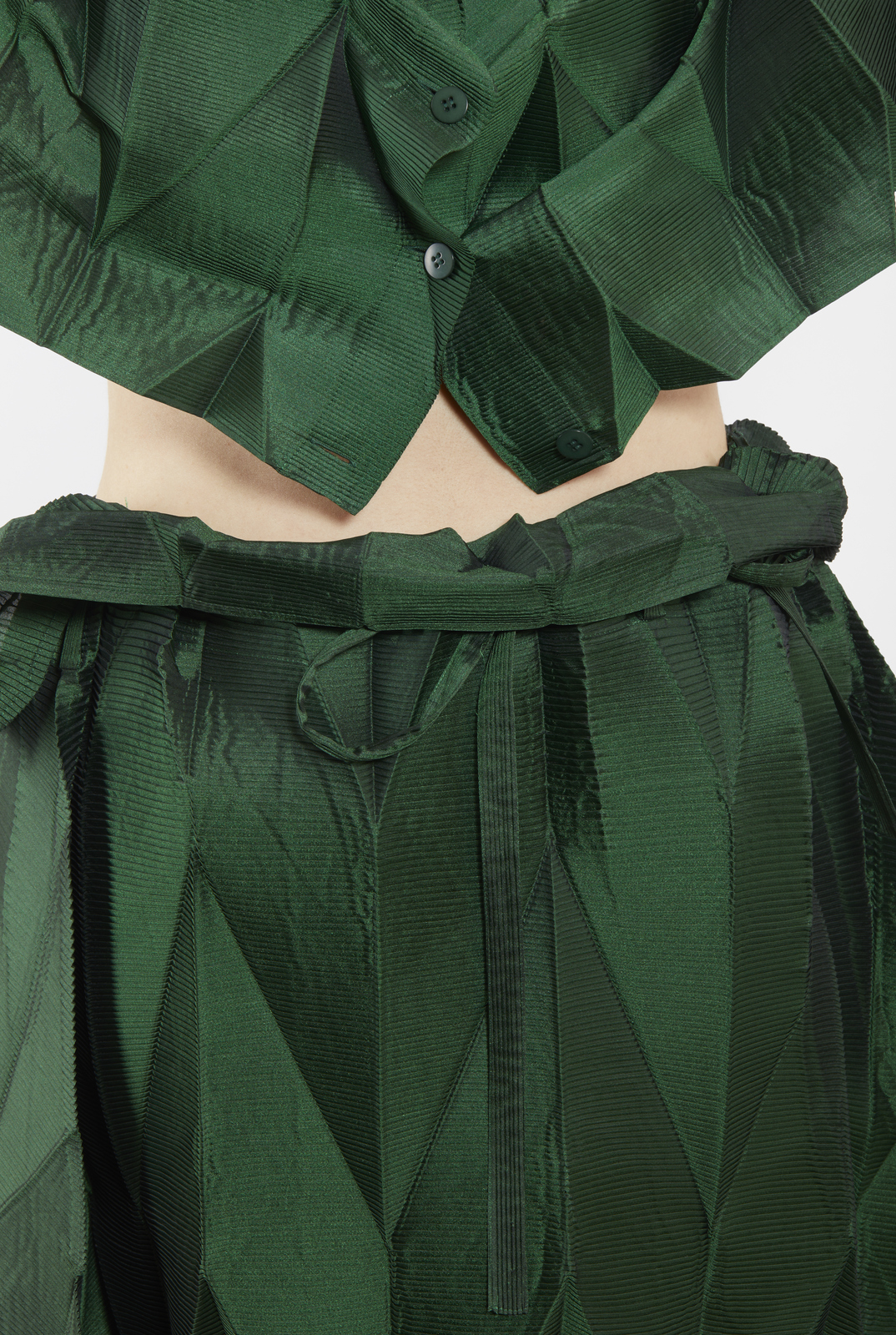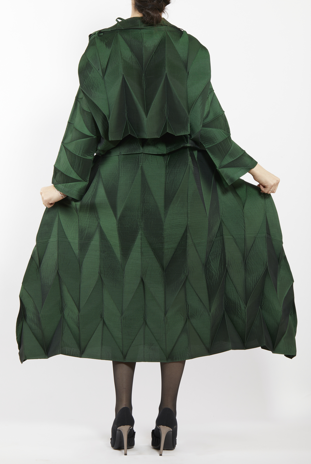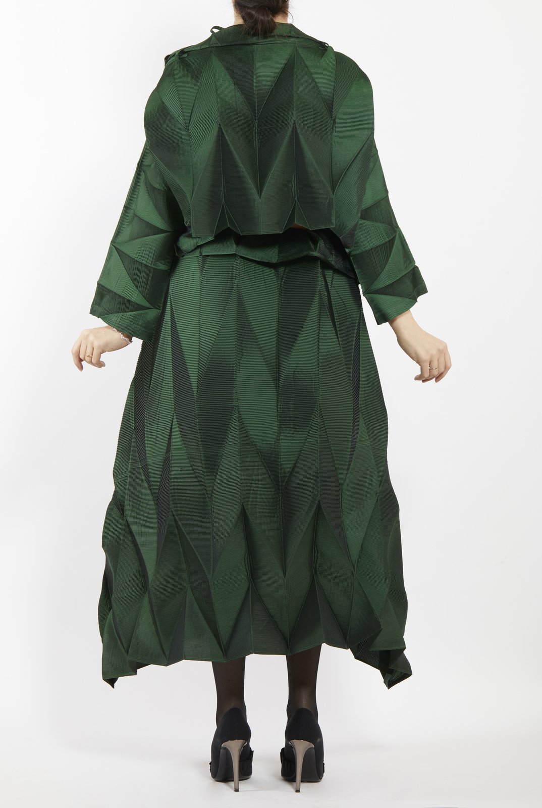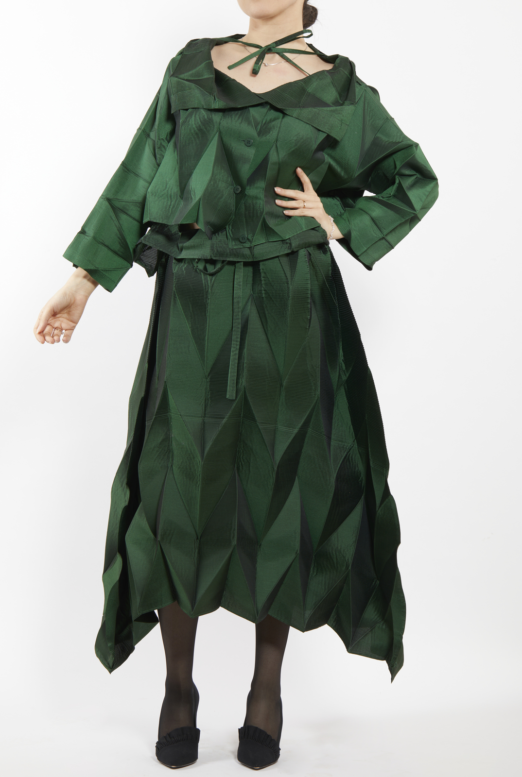 MIYAKE ISSEY (1938 - 2022) Completo giacca e gonna scultura. 2008. Organza. . Completo giacca e gonna a rombi tridimensionali plisse in verde in organza in seta.