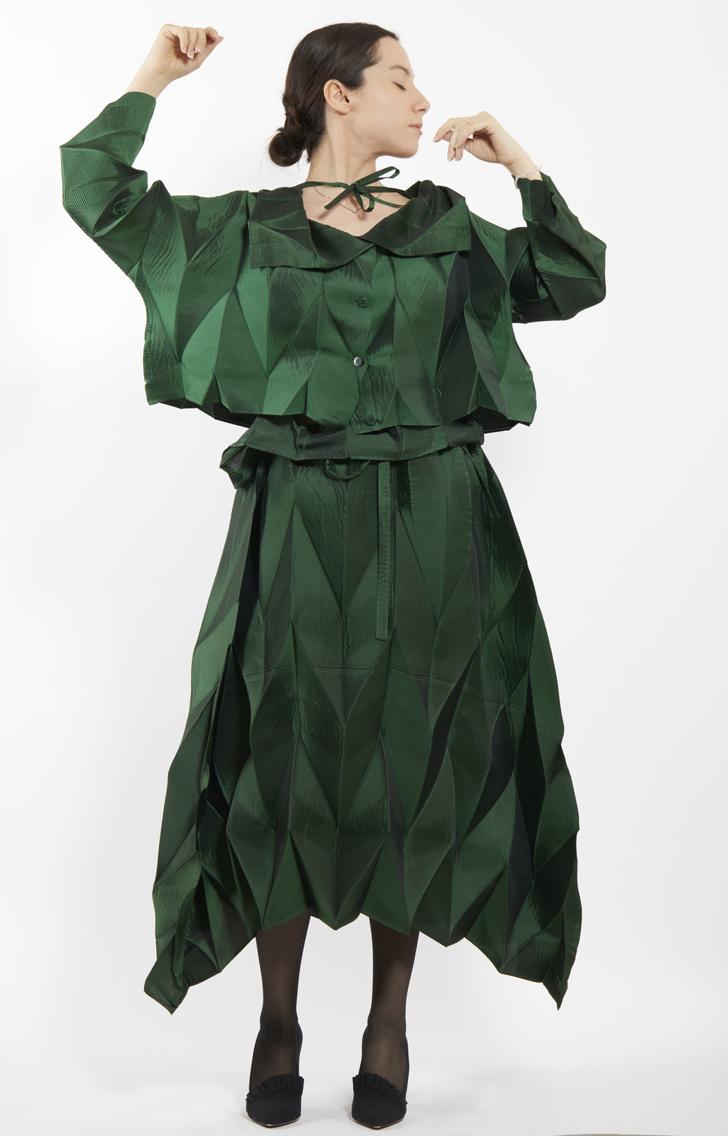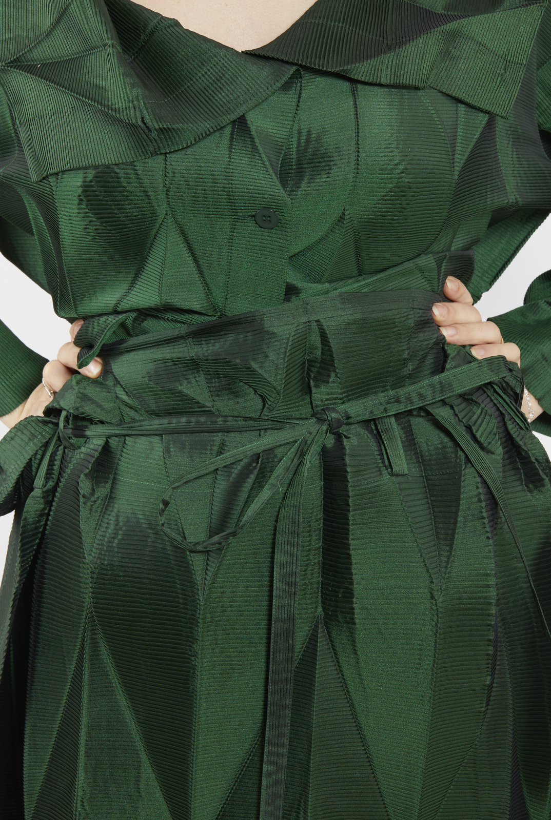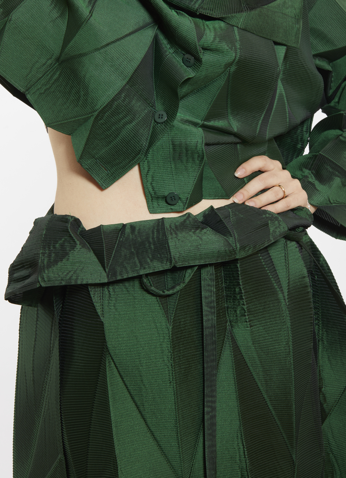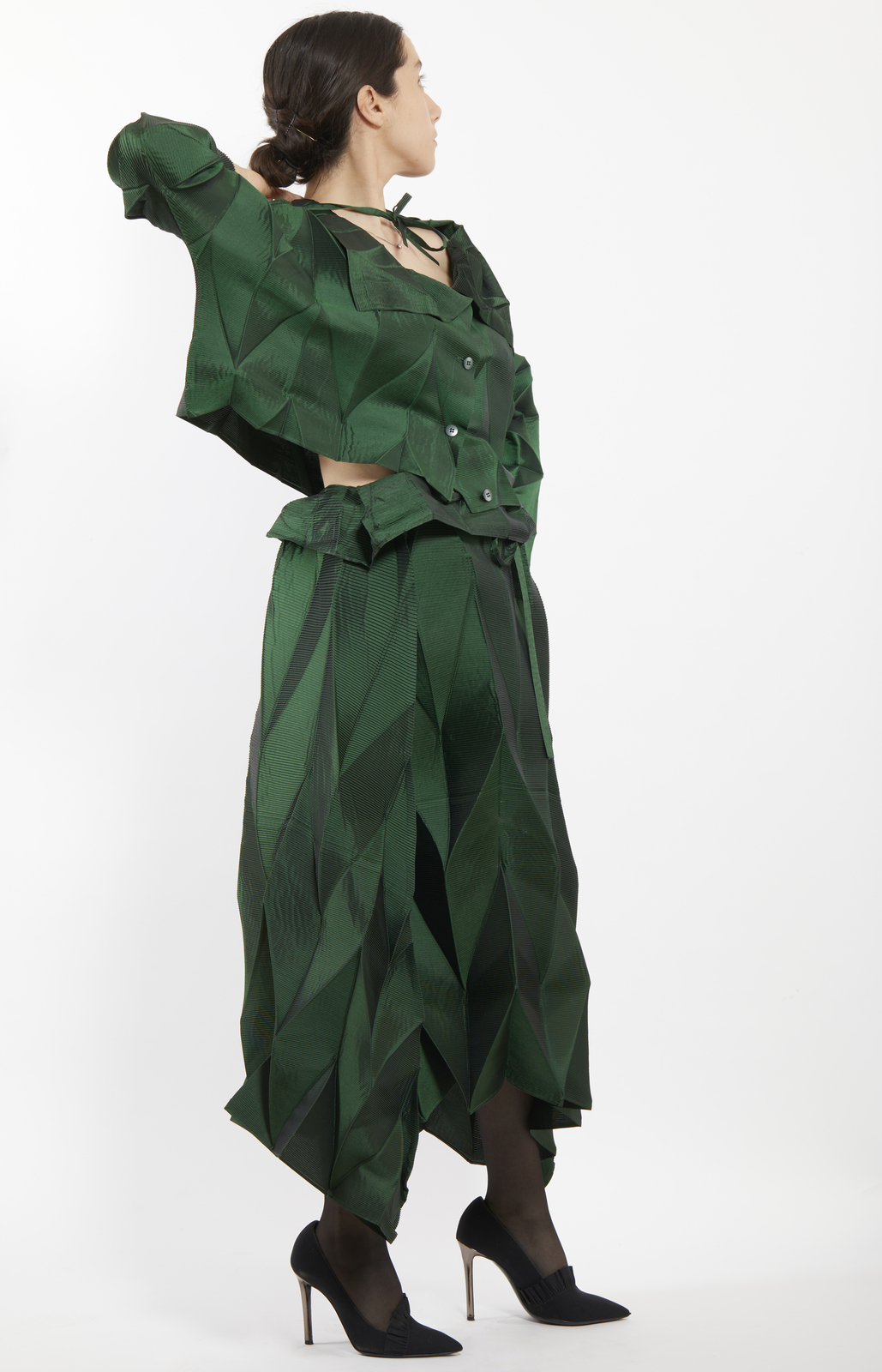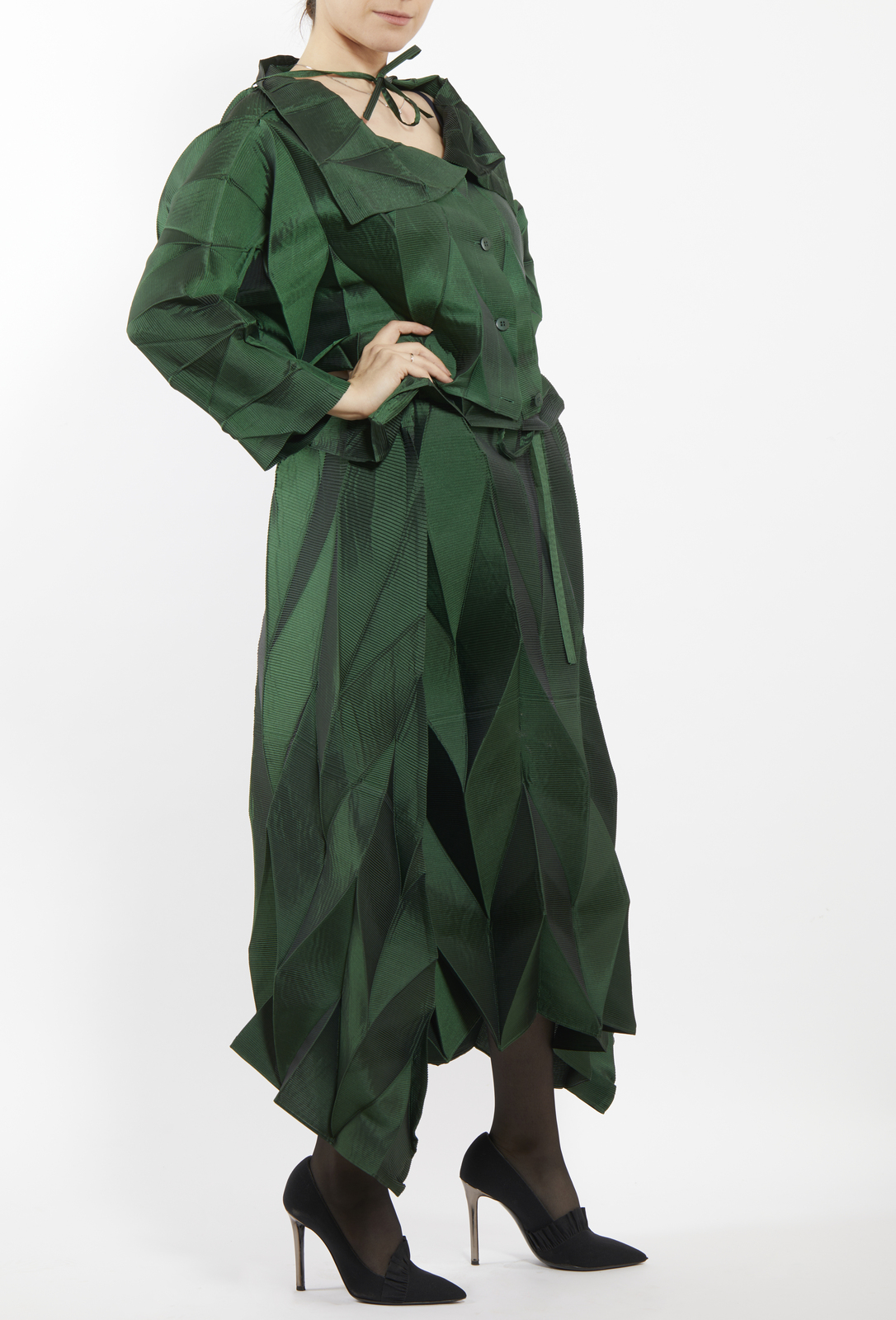 MIYAKE ISSEY (1938 - 2022) Completo giacca e gonna scultura. 2008. Organza. . Completo giacca e gonna a rombi tridimensionali plisse in verde in organza in seta.