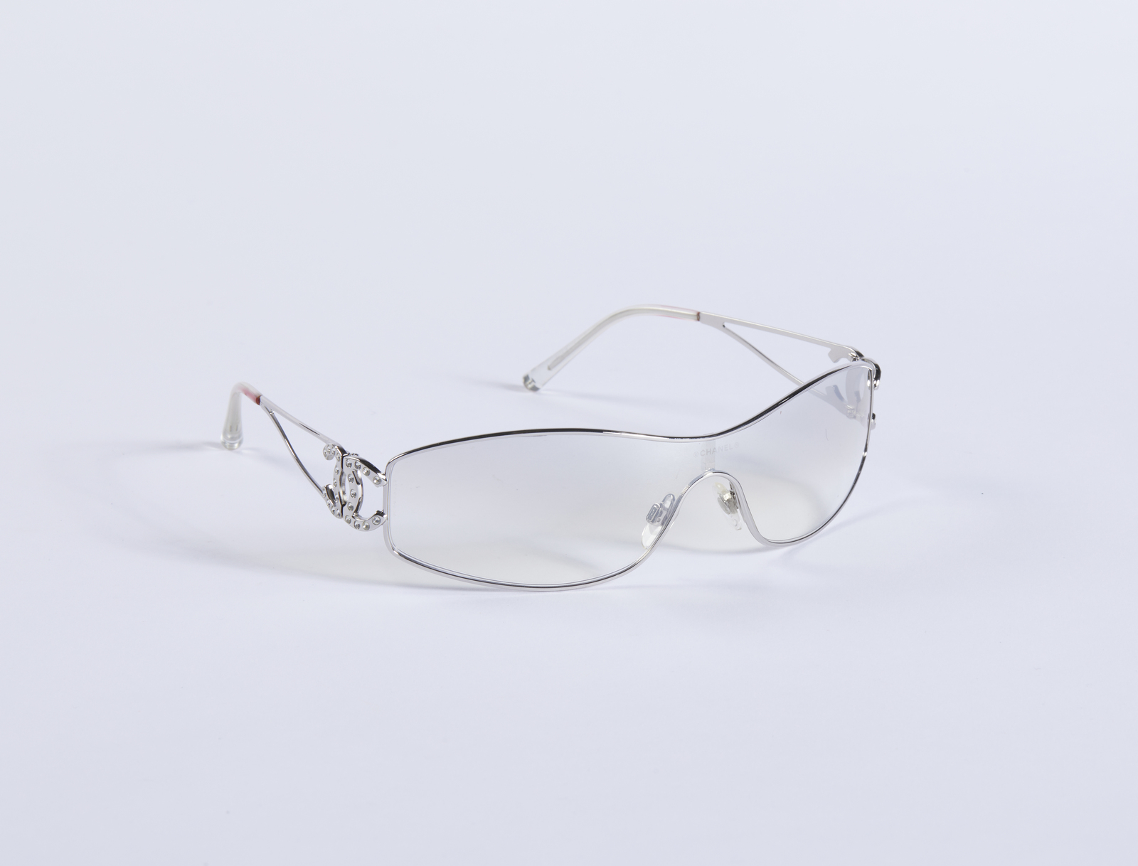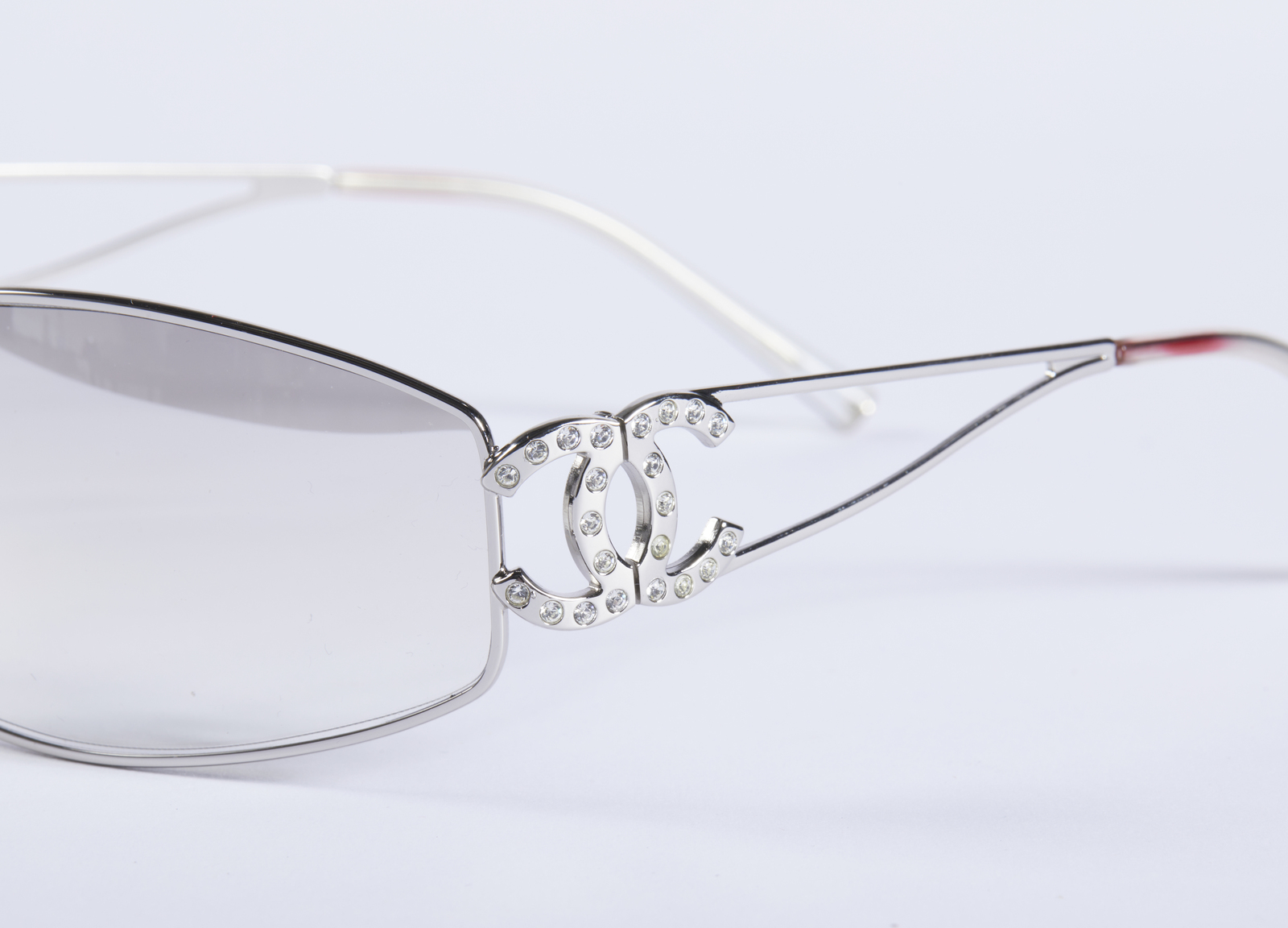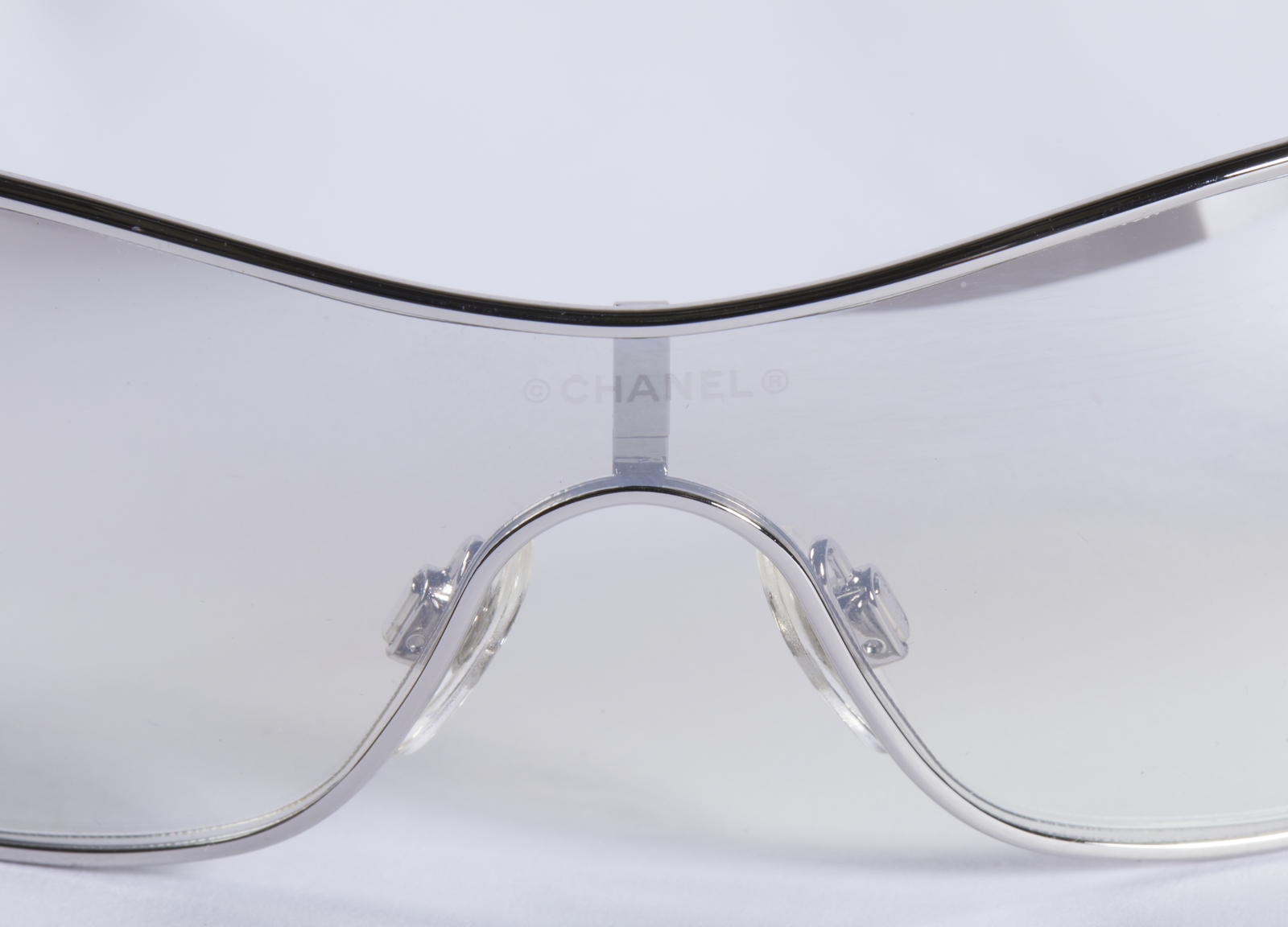 CHANEL Occhiali da sole con lenti molto chiare. . . Occhiali da sole con lenti molto chiare e montatura color argento, logo Chanel in strass.
