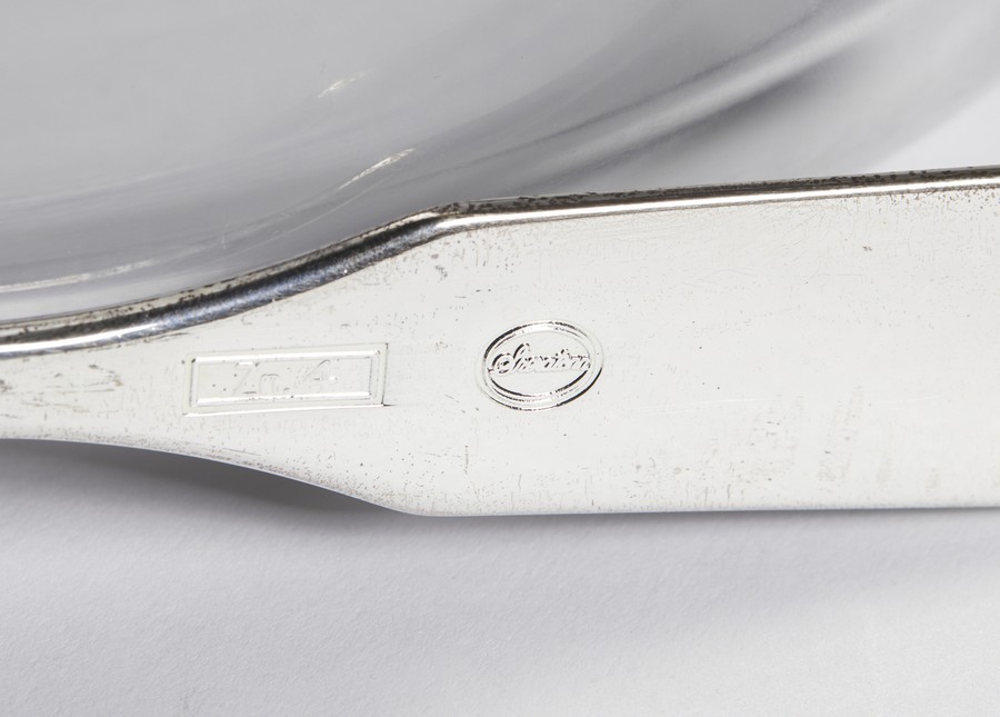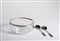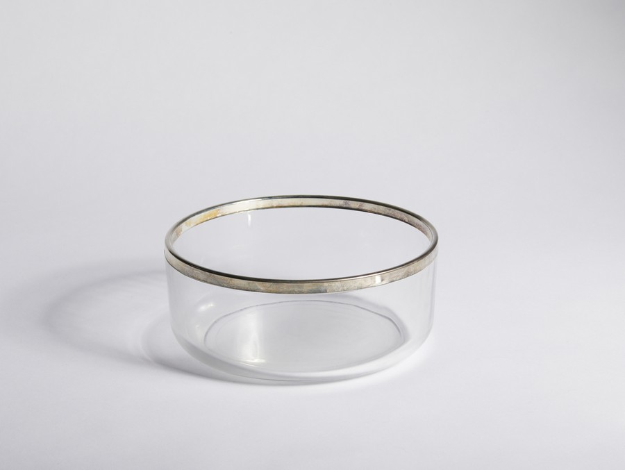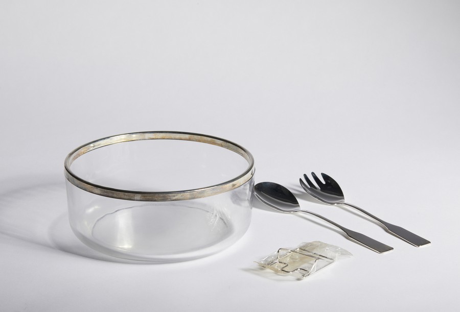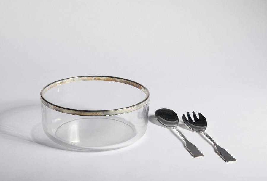 SHERATONN INSALATIERA. Metallo argentato e vetro. Cm 23,00 x 10,00 x 23,00. Insalatiera in vetro con profilo in metallo argentato e cucchiaio e forchetta.