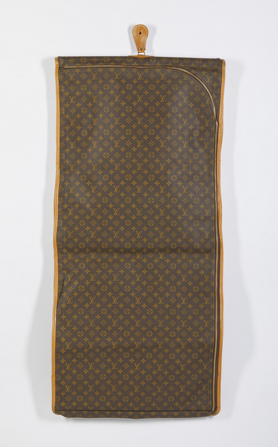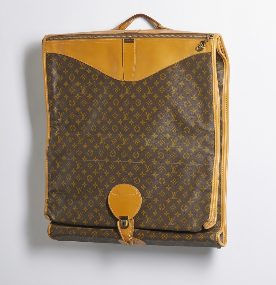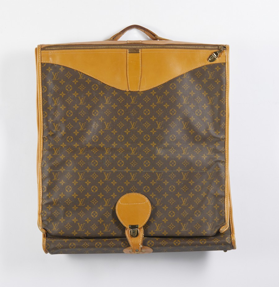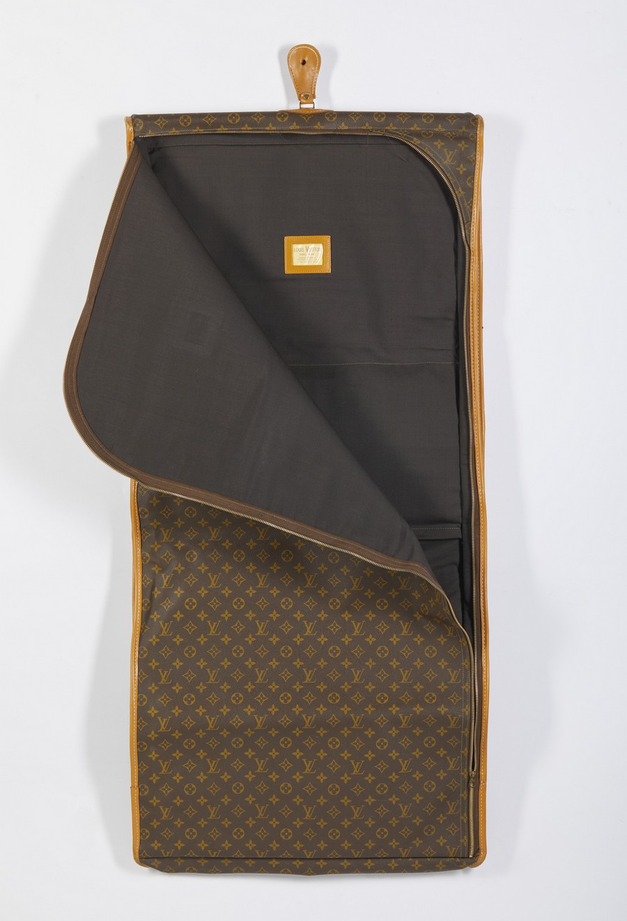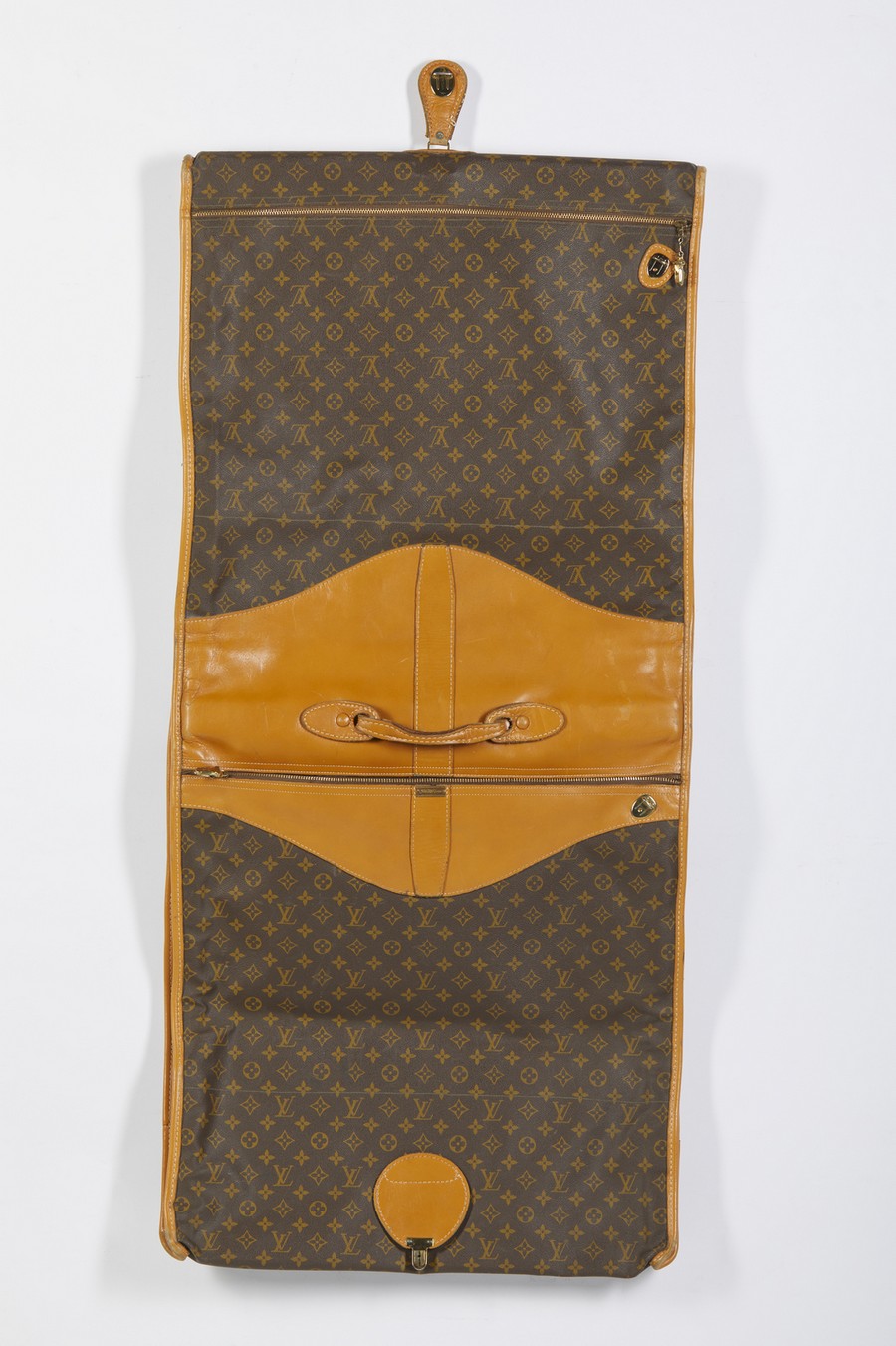 VUITTON LOUIS Cartella porta abiti. Metallo e cuoio.. Cm 59,00 x 125,00 x 5,00. Cartella portabiti in pelle monogram con chiusura a scatto, tasca frontale grande per abiti, manico e tasca ulteriore quando la cartella è chiusa. Presenta targa di Saks Fifth Evenue, New York.