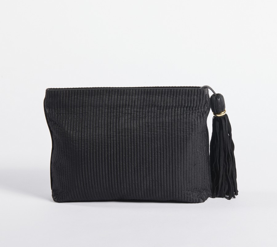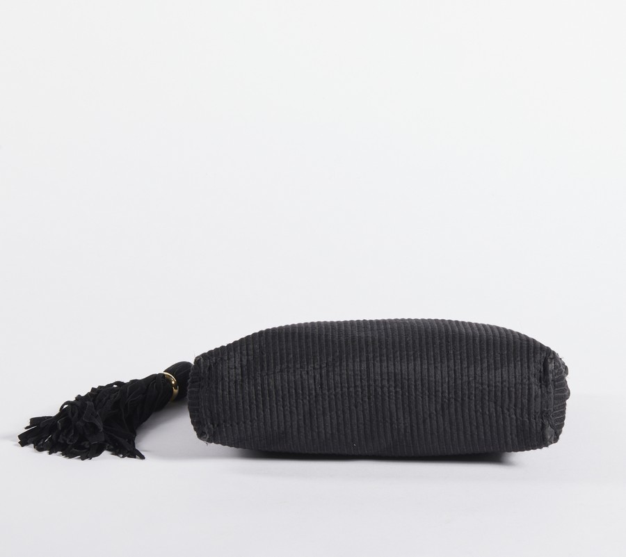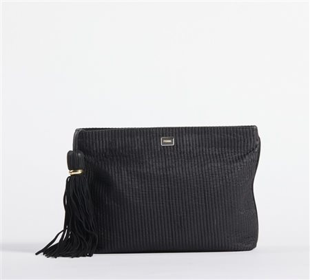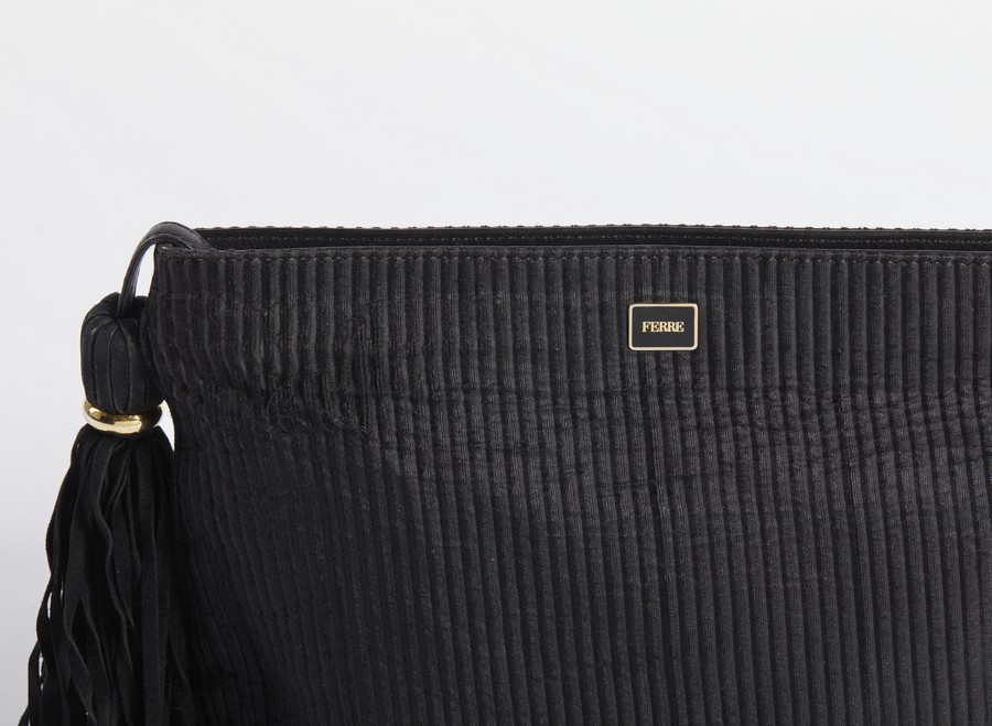 FERRE' GIANFRANCO (1944 - 2007) Pochette in tessuto nero morbido. Tessuto e pelle. Cm 31,00 x 23,00 x 6,00. Pochette in tessuto nero morbido con logo, chiusura a zip e nappa a frange in tessuto. Interno in tessuto monogram con targhetta logata numerata color oro e chiusura con zip.