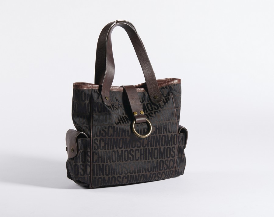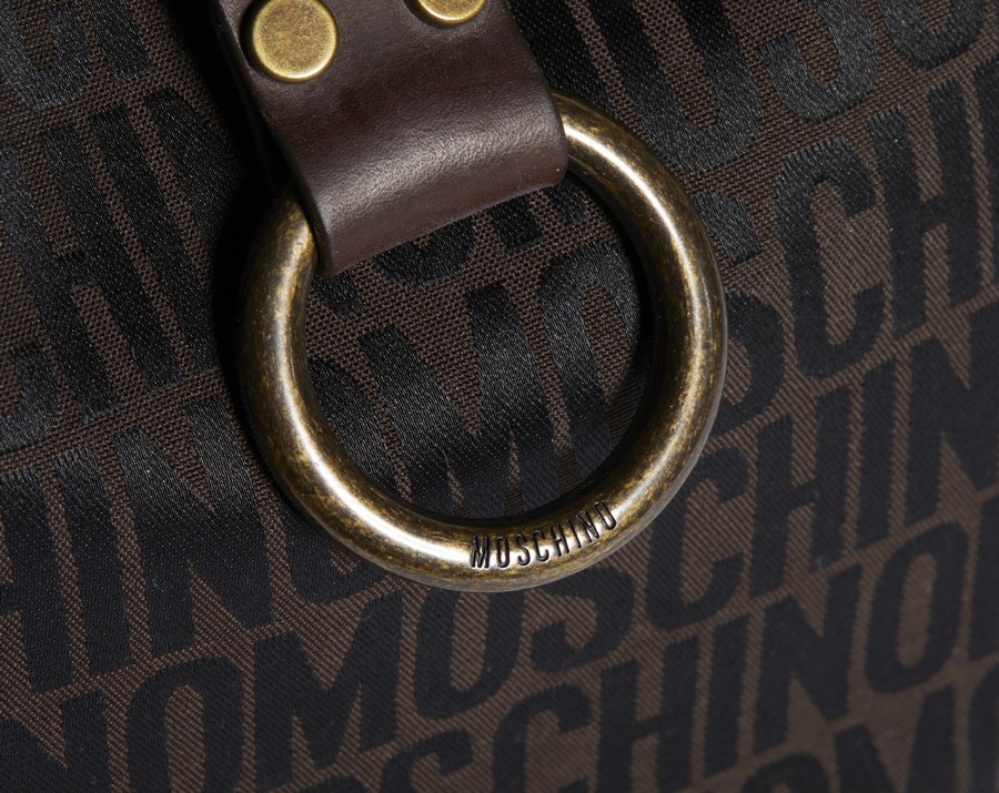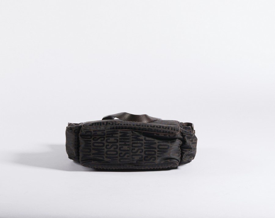 MOSCHINO COUTURE Borsa in tela tessuto logo. acrilico su tessuti apprettati. Cm 32,00 x 28,00 x 10,00. Borsa in tessuto tecnico moschino. Manici in pelle marrone. Tasche laterali. Interno in tessuto nero e tasca interna con logo Moschino.