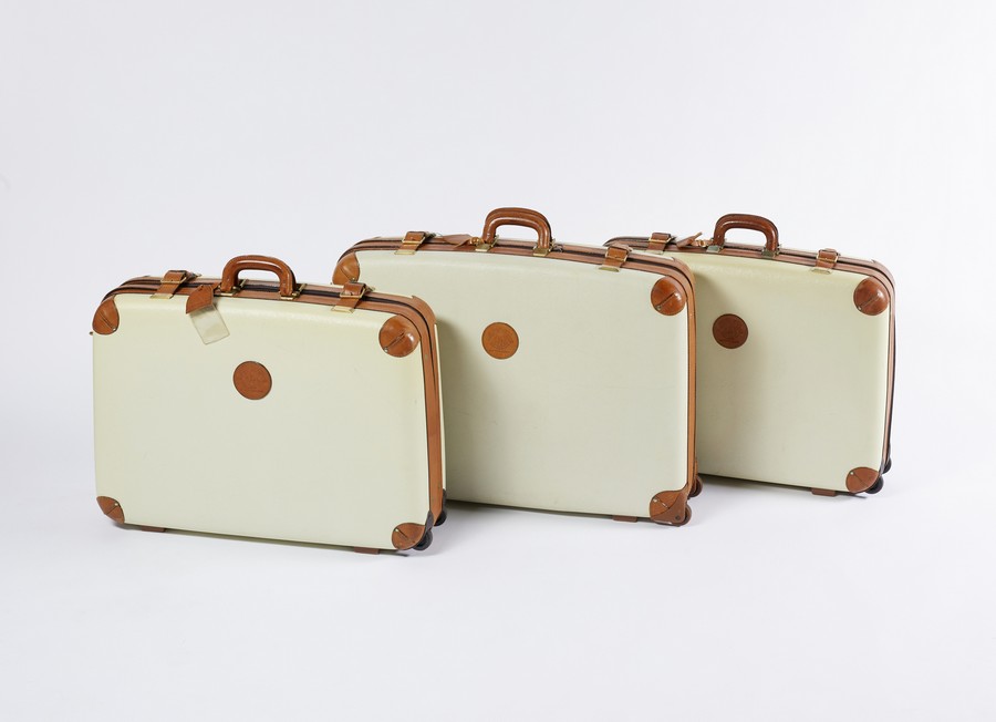 BRIC'S SET DI CINQUE VALIGIE DA VIAGGIO. Cuoio e tessuto. . Set di cinque valigie da viaggio bicolore con logo centrale in policarbonato, inserti in cuoio, interni in tessuto e hardware color oro, prodotte da Bojola a Firenze. Set composto da: