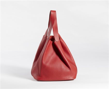 HERMES Borsa Picotin Lock 26 in pelle rossa. Pelle. Cm 31,00 x 50,00 x 26,00. Nessuna fodera, bordi a taglio vivo cucitura centrale e patta regolabile prezioso lucchetto a chiusura della borsa . Senza chiave.