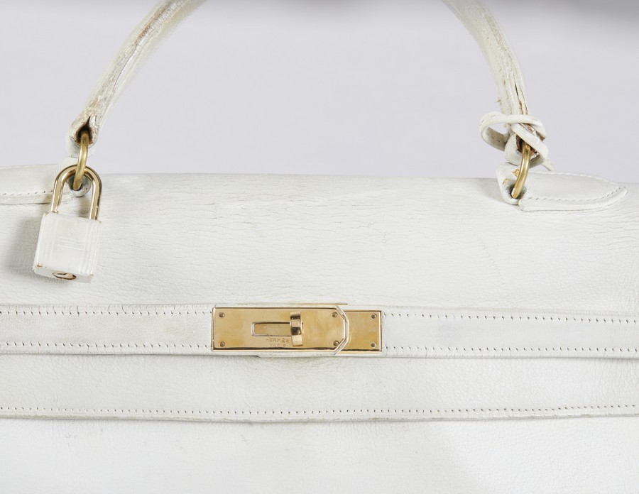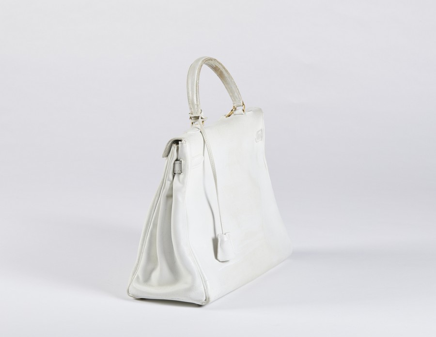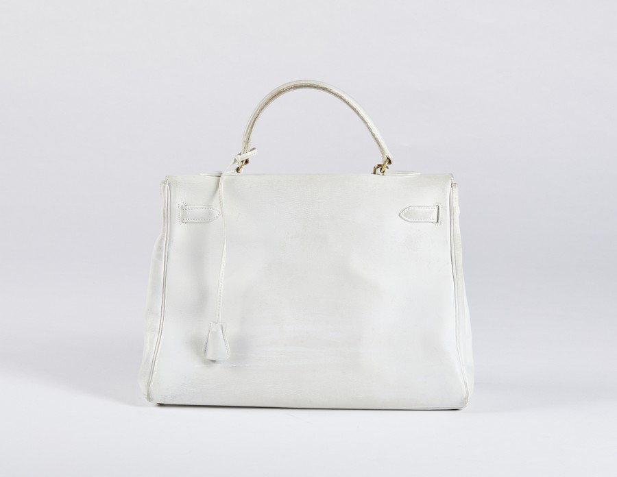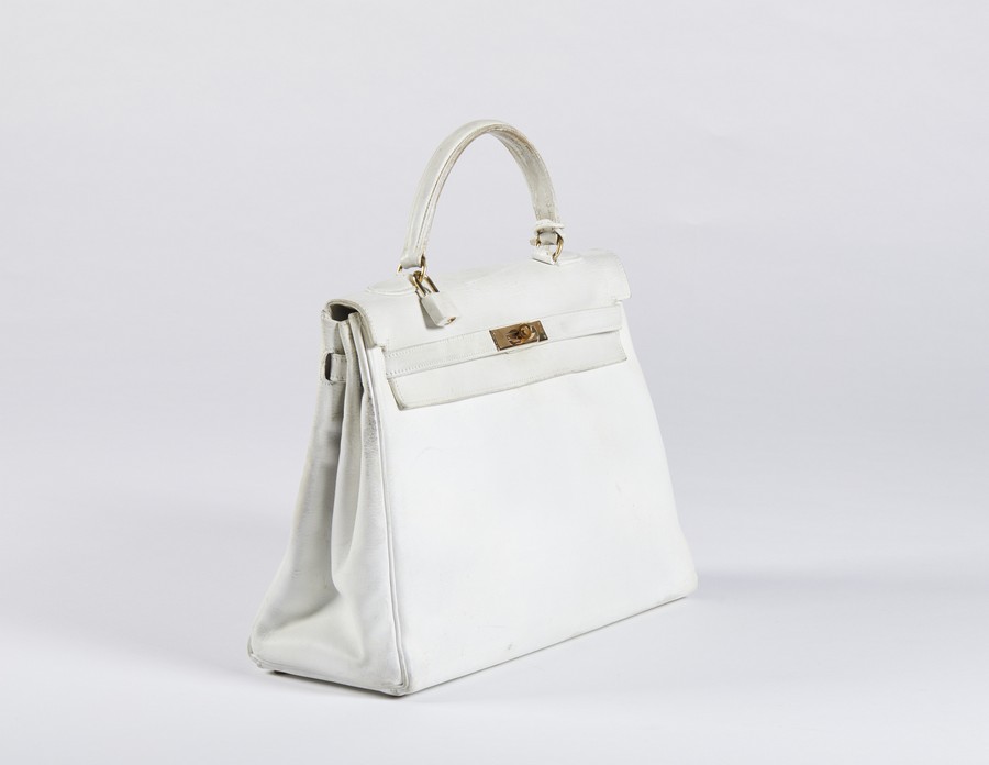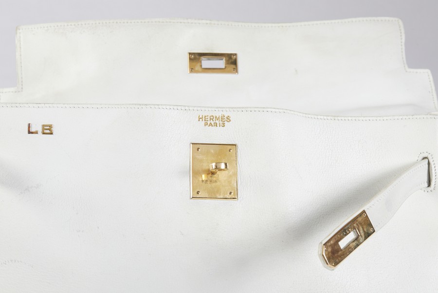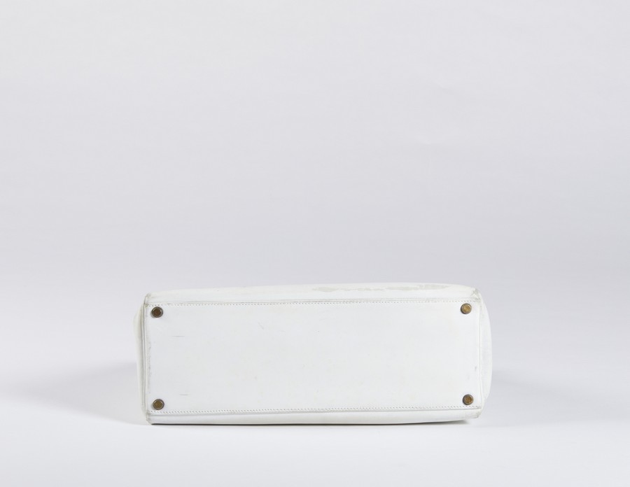 HERMES Borsa Kelly bianca, anno 1959. 1959. Pelle. Cm 35,00 x 27,00. Borsa degli anni 50' Kelly in pelle bianca. Iniziali L.B. Difetti presenti