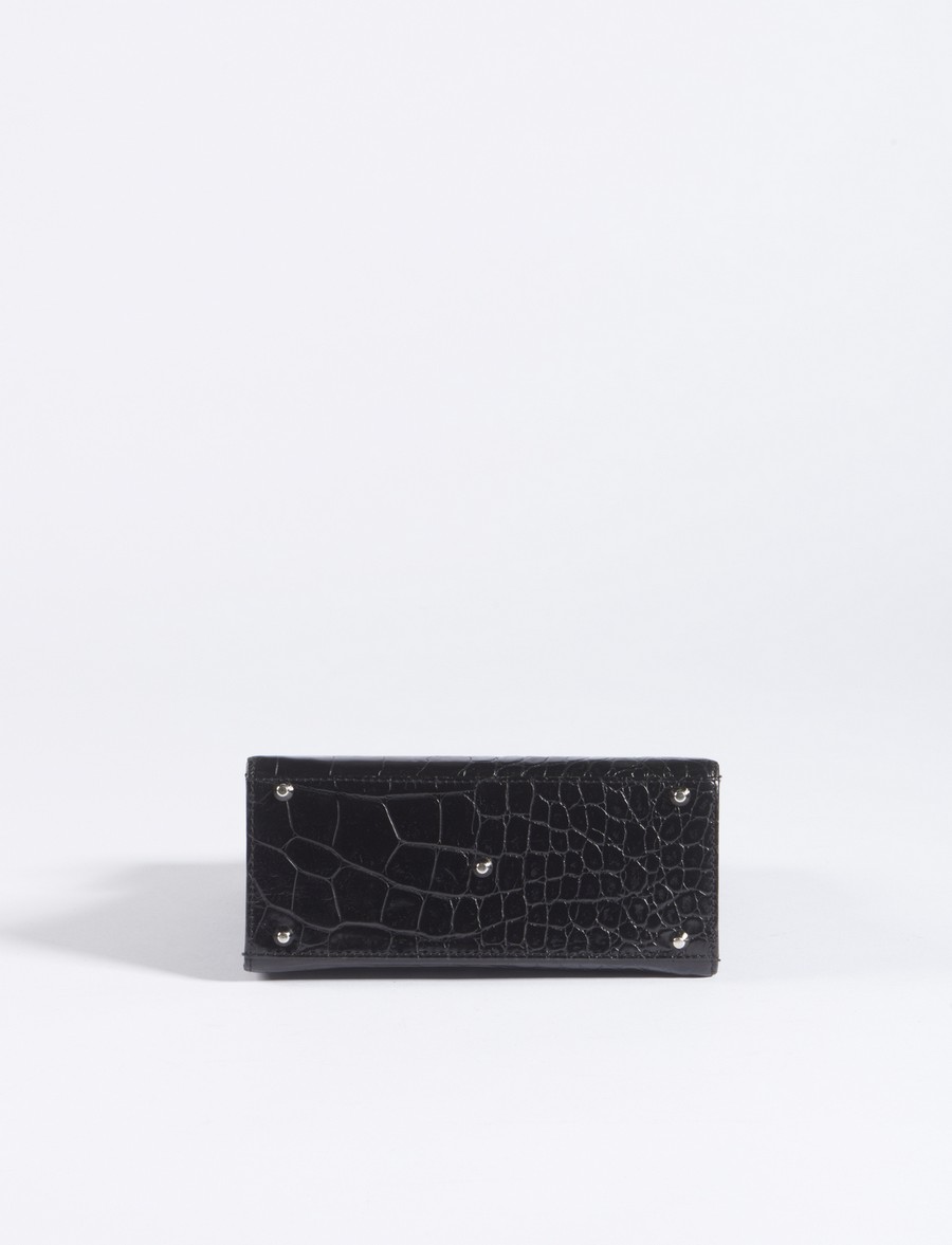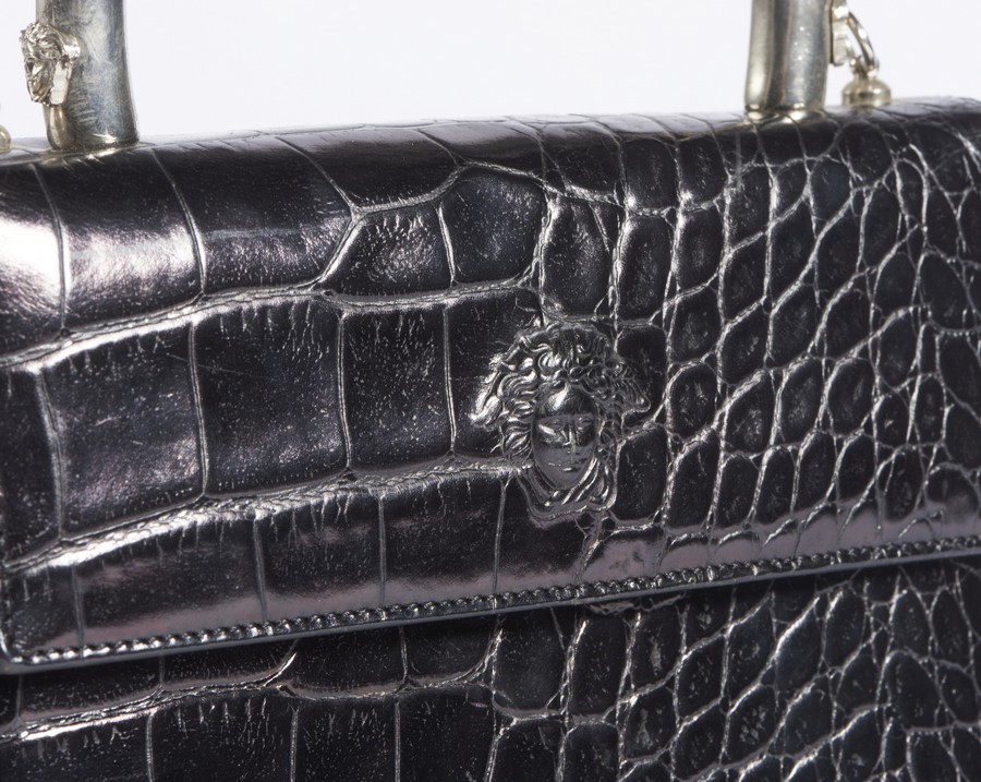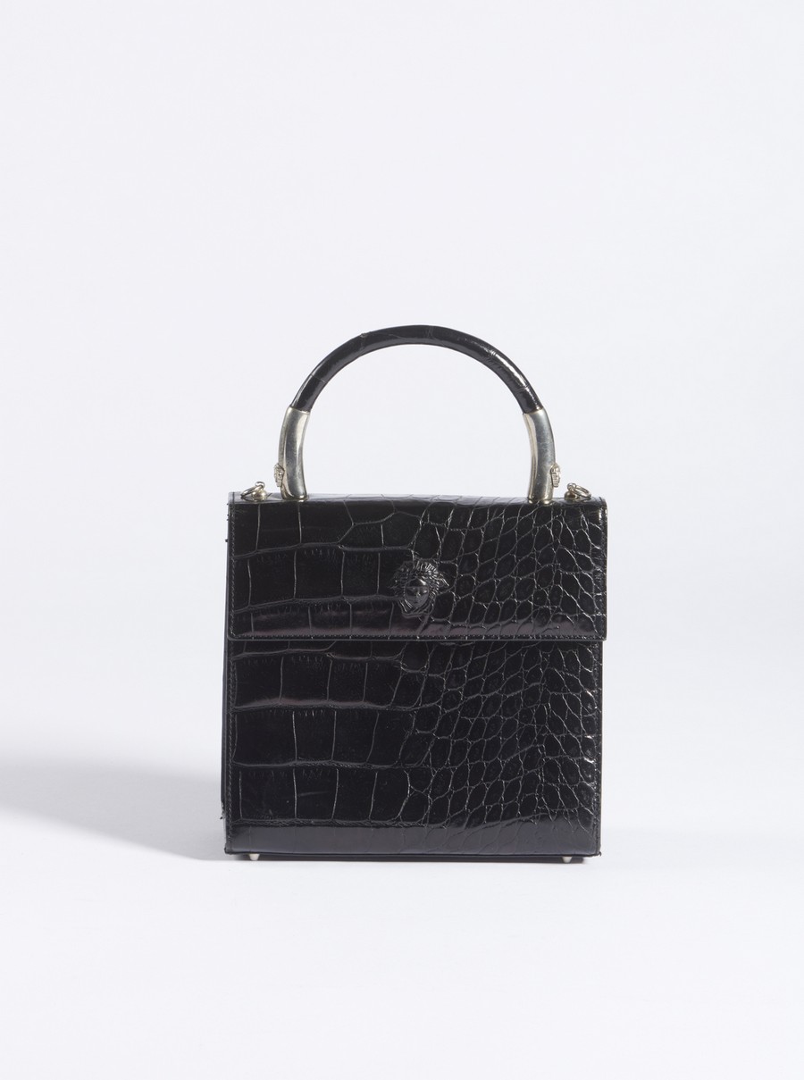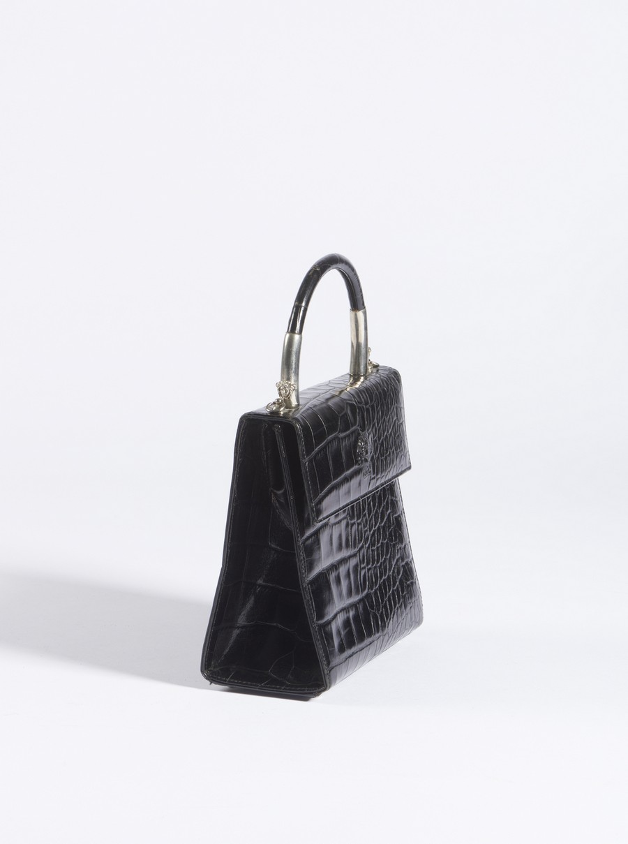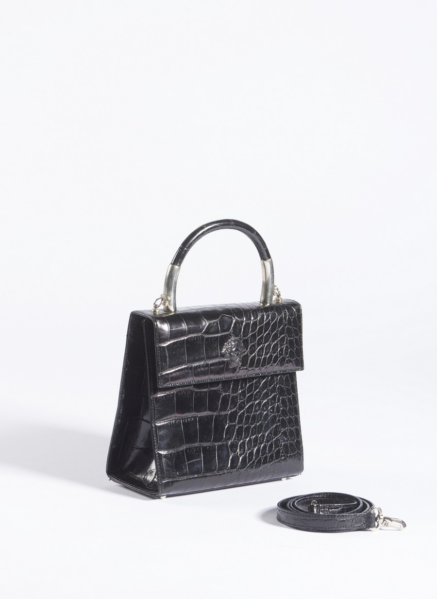 VERSACE GIANNI (1946 - 1997) Borsa a mano. Metallo e pelle. Cm 18,00 x 17,00 x 7,50. Borsa a mano nera in pelle stampa cocco, con manico a mano e finiture in metallo con logo medusa, anni 90'. Tracolla removibile.