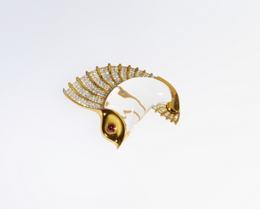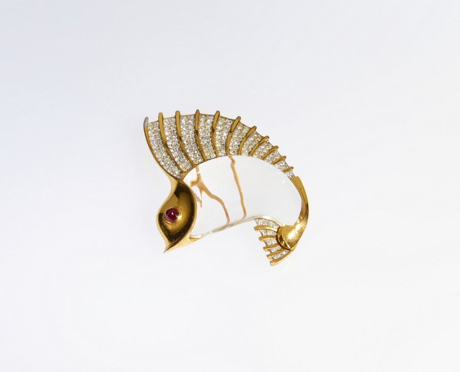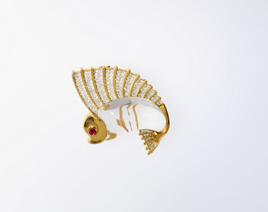 TRIFARI - Spilla anni '40 Jelly Belly Salifish con cristallo di rocca liscio cabochon e pietre sintetiche bianche e rosse.Progettata da Norman Bel Geddes. .