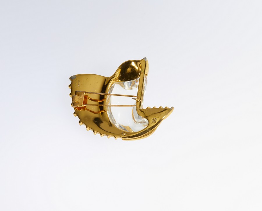 TRIFARI Spilla anni '40 Jelly Belly Salifish con cristallo di rocca liscio cabochon e pietre sintetiche bianche e rosse.Progettata da Norman Bel Geddes. . . Cm 7,00 x 8,00.