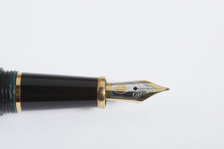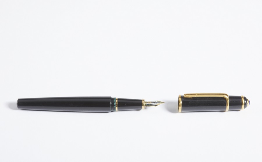 CARTIER Penna Diablo. . . Penna stilografica Diablo, pennino in oro 18k, corpo in resina nera e dettaglio resina blu sul cappuccio.