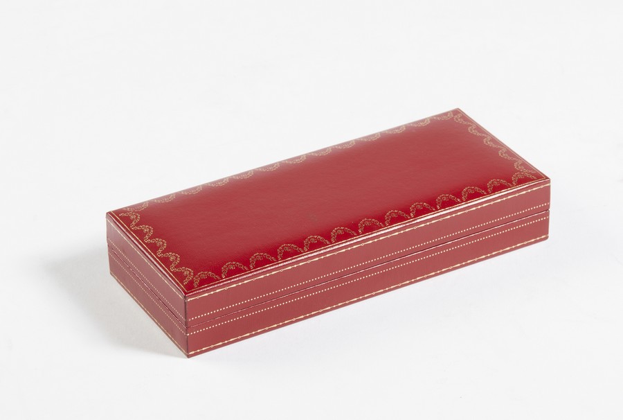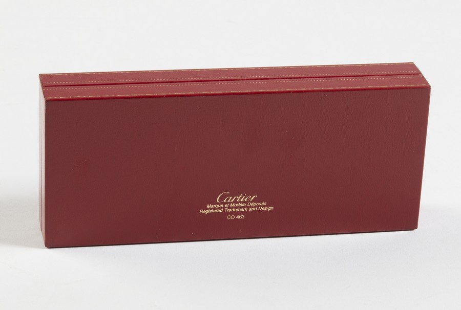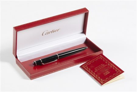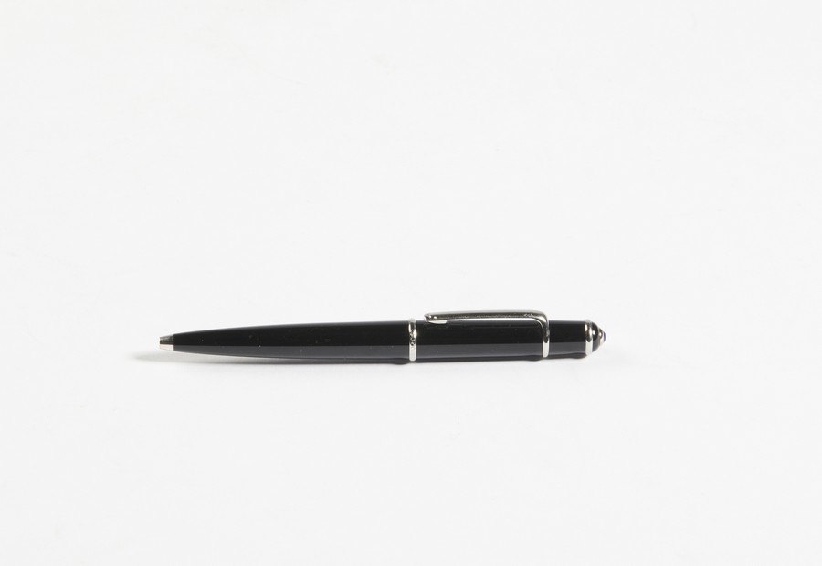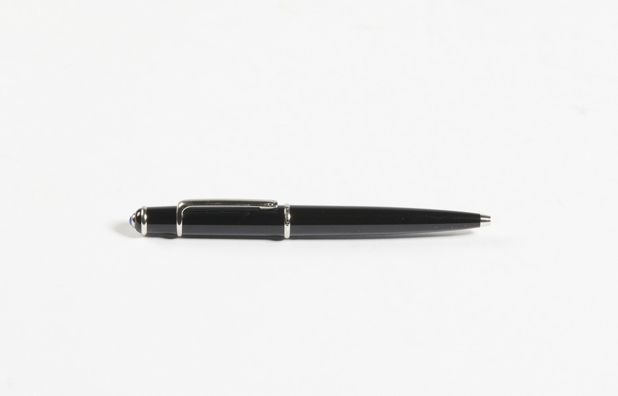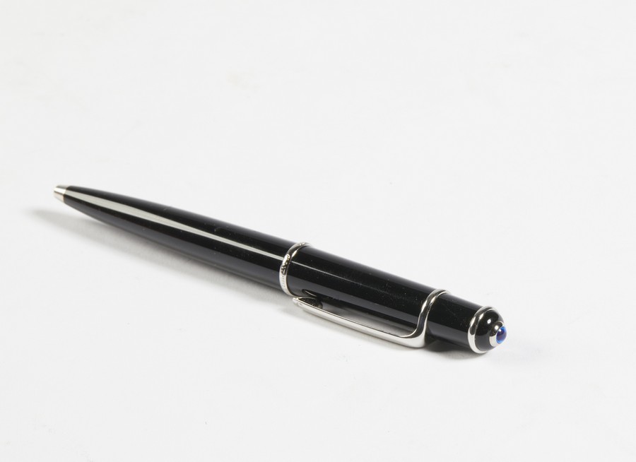 CARTIER Penna a sfera Diablo. 2000. Acciaio cromato e plastica. . Penna a sfera retrattile Cartier Diablo nero con cabochon blu. Codice di garanzia n. 019075, custodia presente.