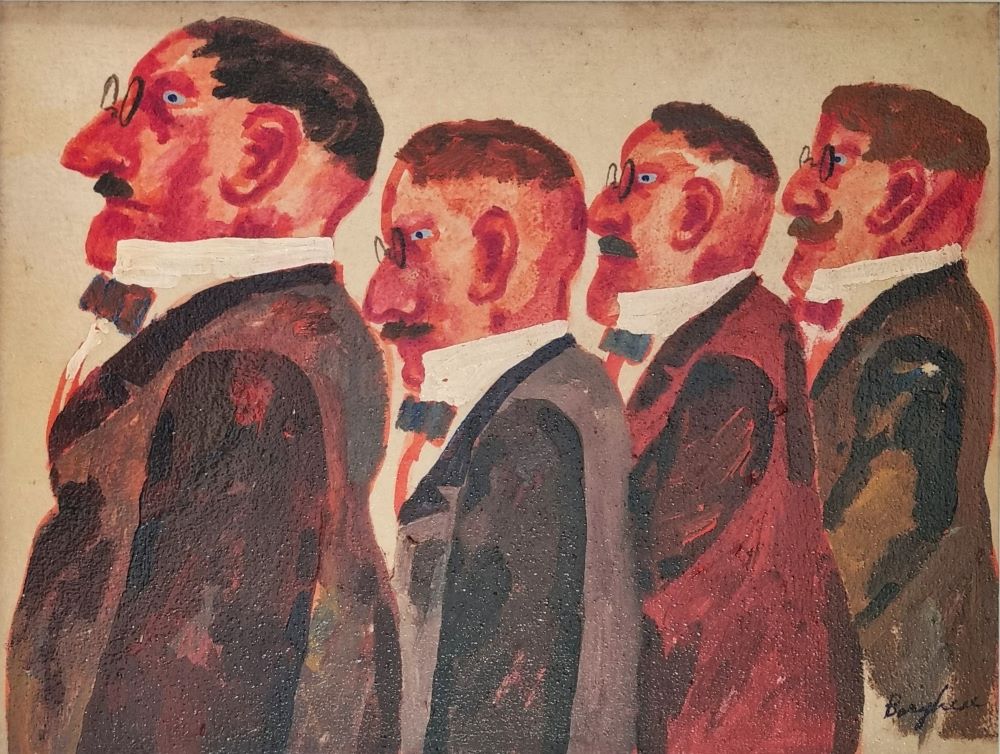 BORGHESE FRANZ Roma 1941 - 2005 "Quattro personaggi" Olio su tela cm 40x30. Firmato sul fronte in basso a destra e al verso. Archiviazione su foto a cura di Studio Franz Borghese - Archivio Generale.
