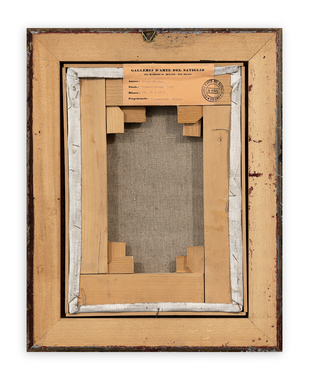 Etichetta e timbro della Galleria d'Arte del Naviglio (MI) con caratteristiche tecniche dell'opera al retro