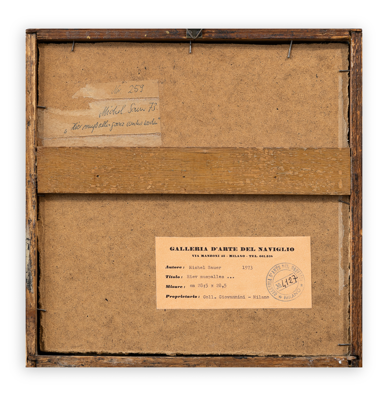 Etichetta e timbro della Galleria d'Arte del Naviglio (MI) con caratteristiche tecniche dell'opera al retro