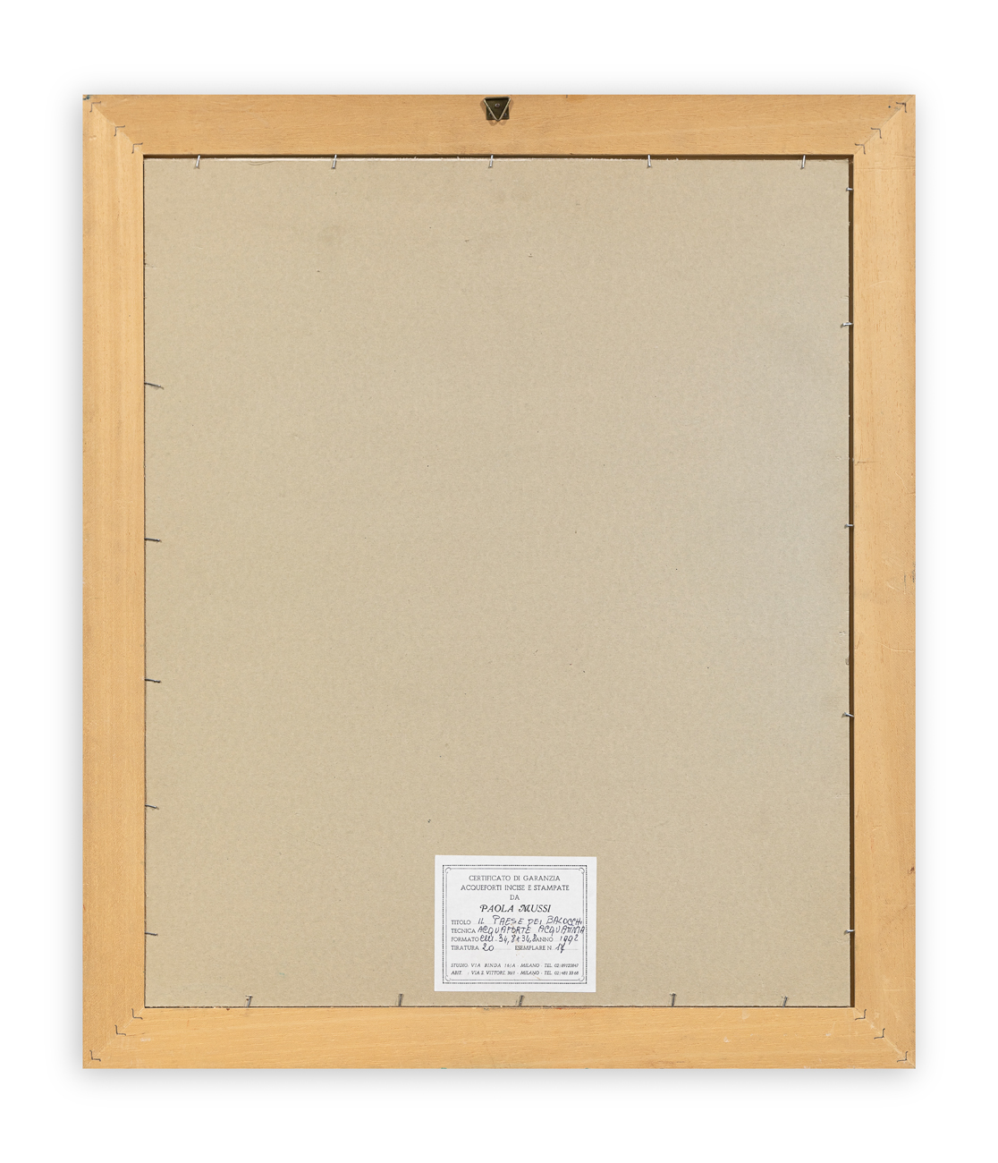 Etichetta dell'Artista con caratteristiche tecniche dell'opera al retro del cartoncino protettivo
