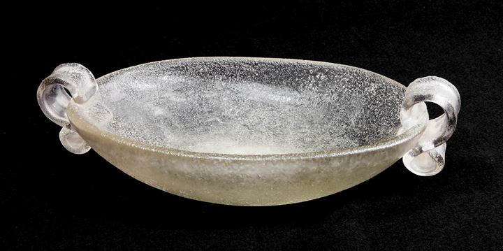 Coppa con applicazioni a nastro, vetro corroso e lievemente iridato.