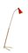 Lampada da terra regolabile in altezza, struttura in ottone e legno, diffusore in metallo laccato rosso.