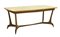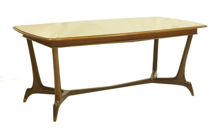Tavolo in legno di noce, piano in vetro e puntali in ottone.