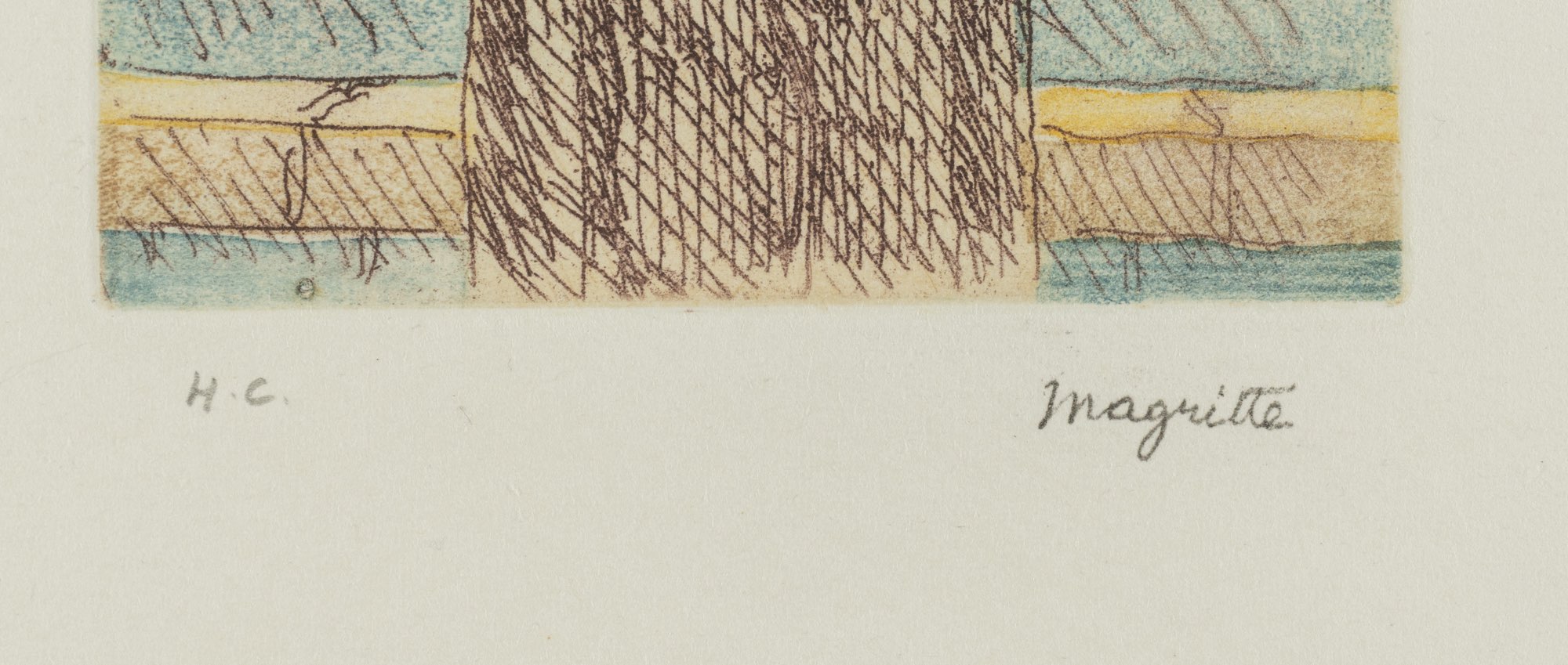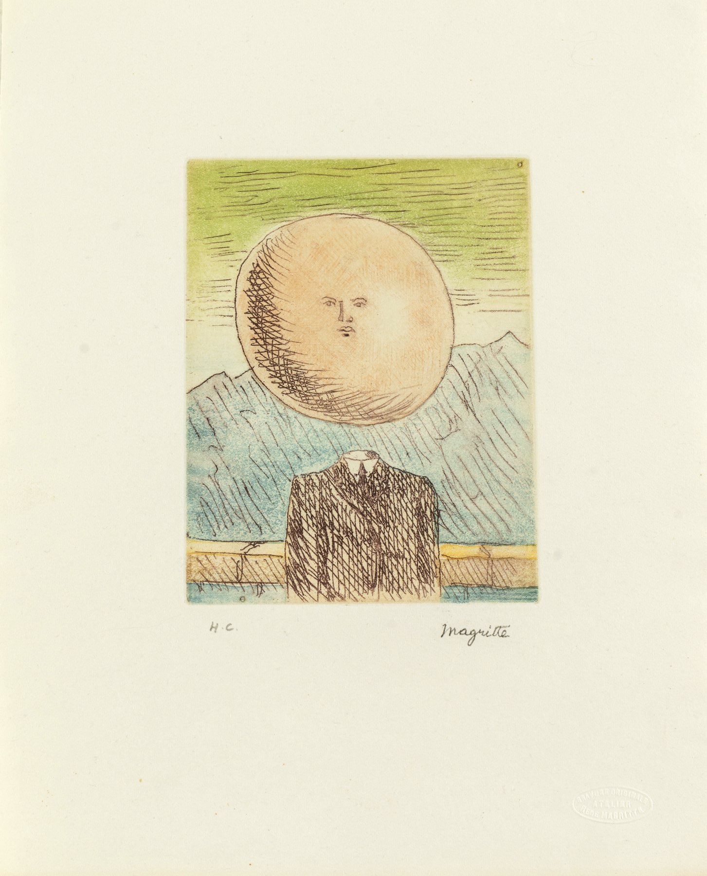 Acquaforte su carta japon, reca firma in basso a destra, numero di esemplare in basso a sinistra H.C., timbro a secco “Bravure originale Atelier Rene Magritte”, foglio H cm 28x23, lastra H cm 19,5x14,6 - Bibliografia di riferimento: The Graphic Work of Rene Magritte, a cura di Kaplan Gilbert E. e Timothy Baum, II Editions, Institutional Investor Inc. New York, 1982 N.16.