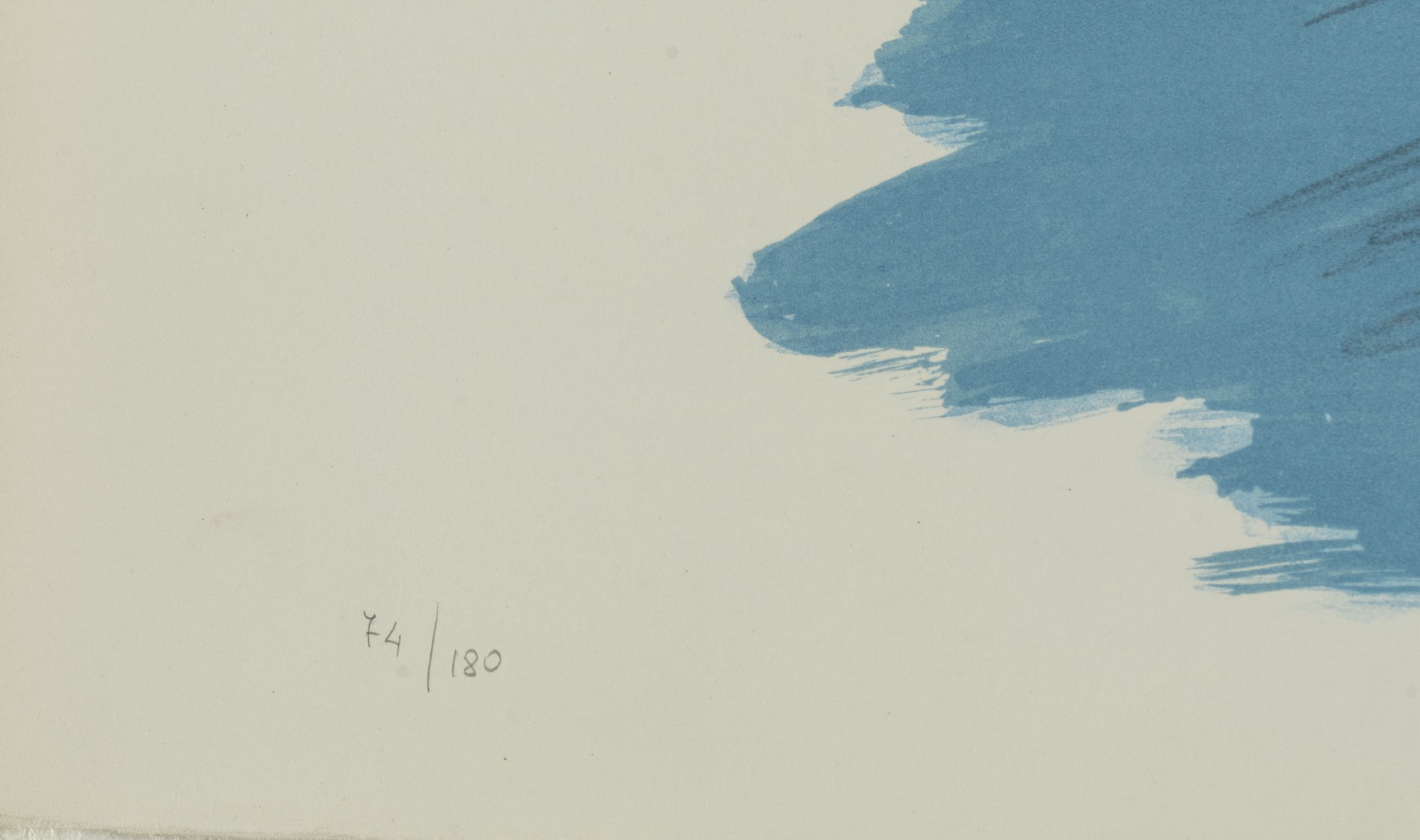 Litografia a cinque colori, presenta a matita firma in basso a destra e numerazione 74/180 in basso a sinistra, reca timbro a secco ed etichetta della Stamperia d’arte “Grafica dei Greci – Roma”, edizione particolare delle Terme di Porretta, foglio H cm 50x71