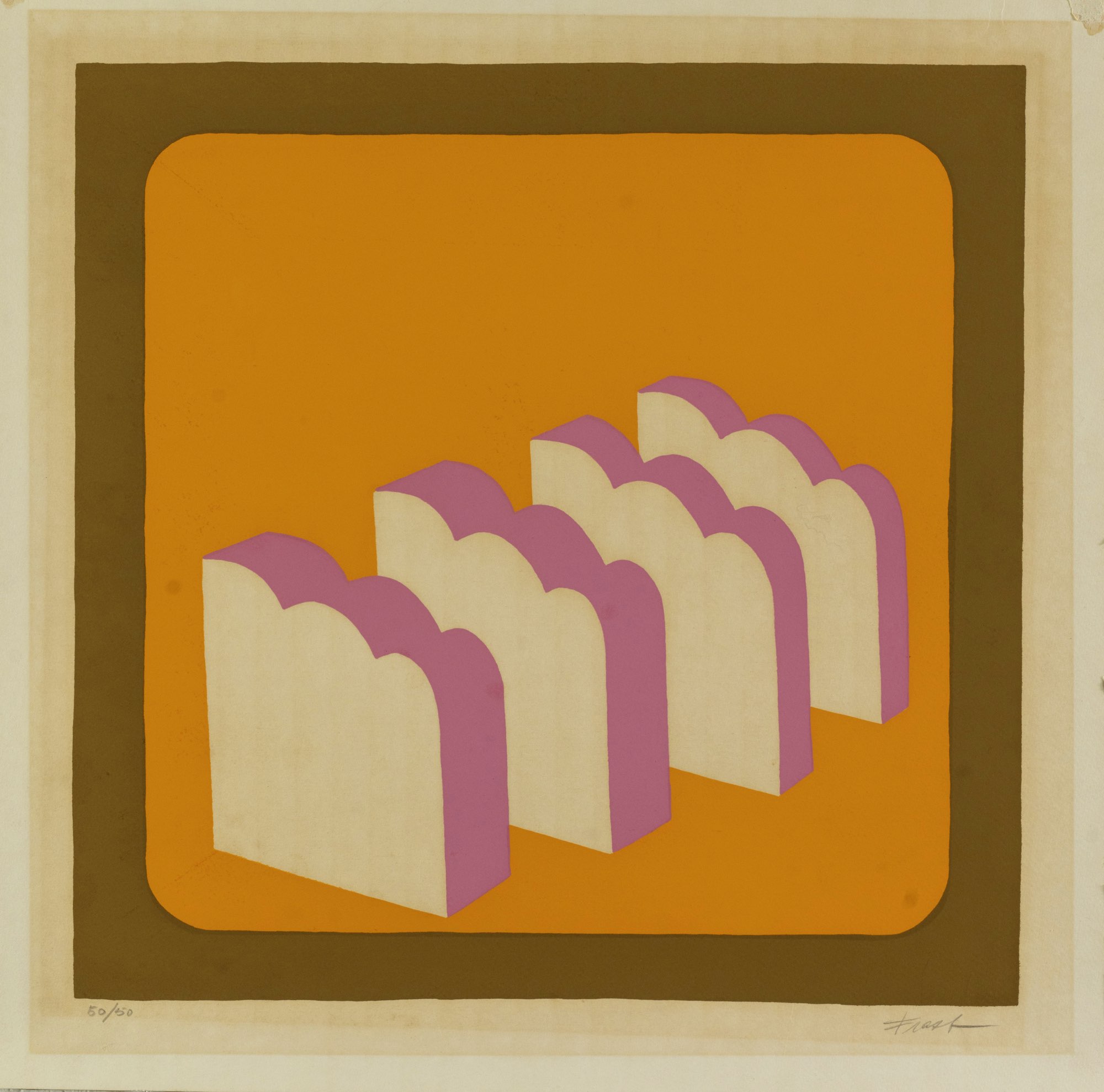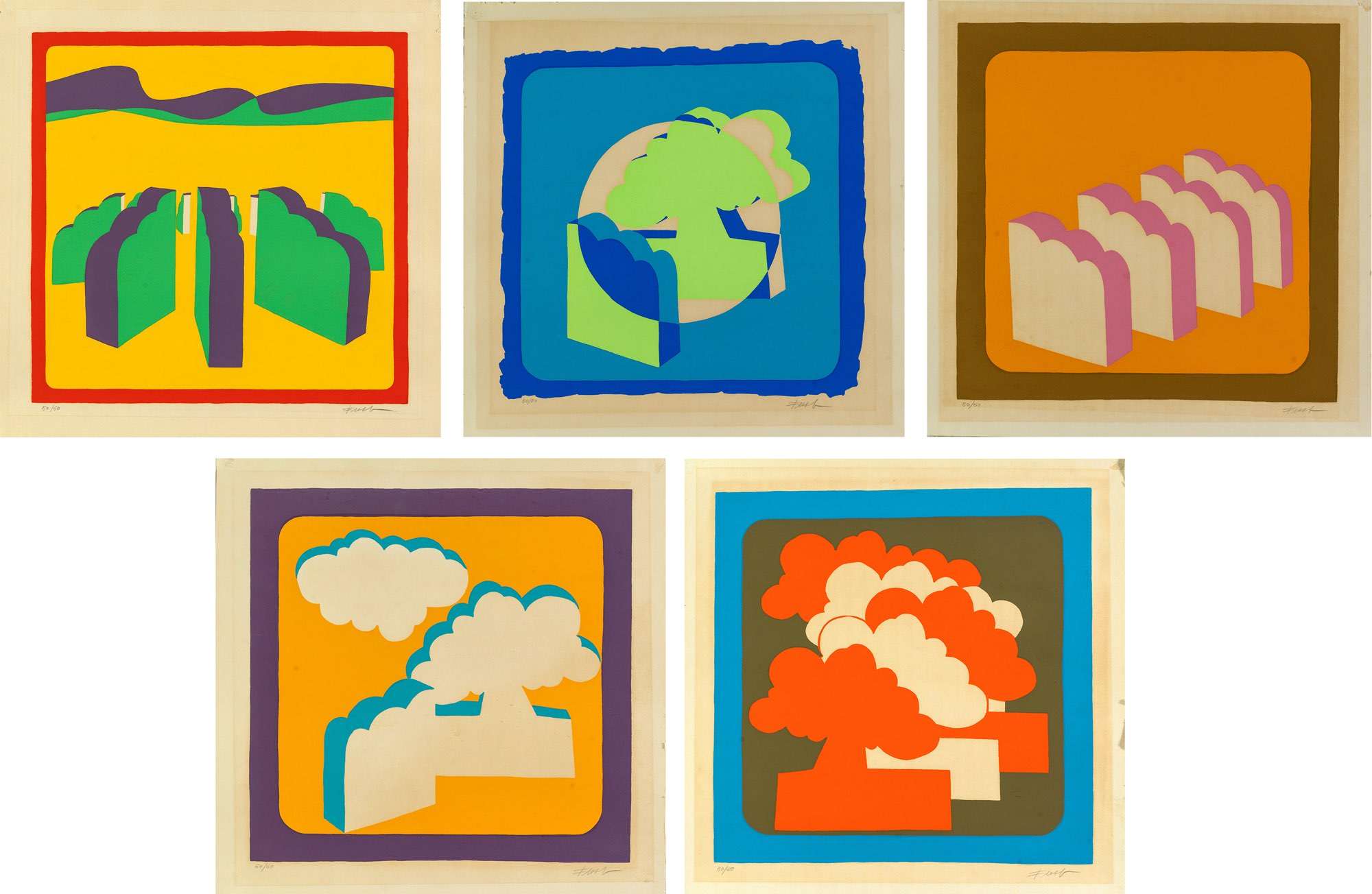 Cinque serigrafie a colori su carta, dalla Cartella “Il Segnapassi di Pesaro”, tutte recano firma a matita in basso a destra e numerazione 50/50 in basso a sinistra, foglio H cm 50x50