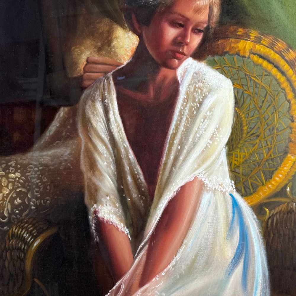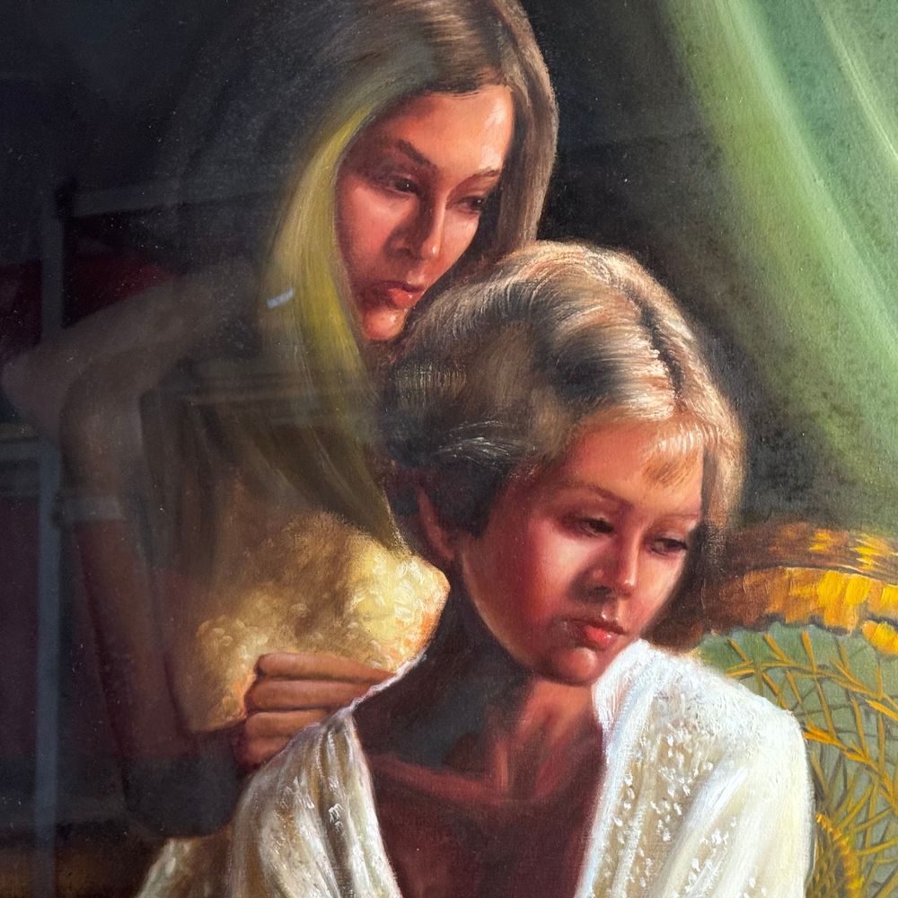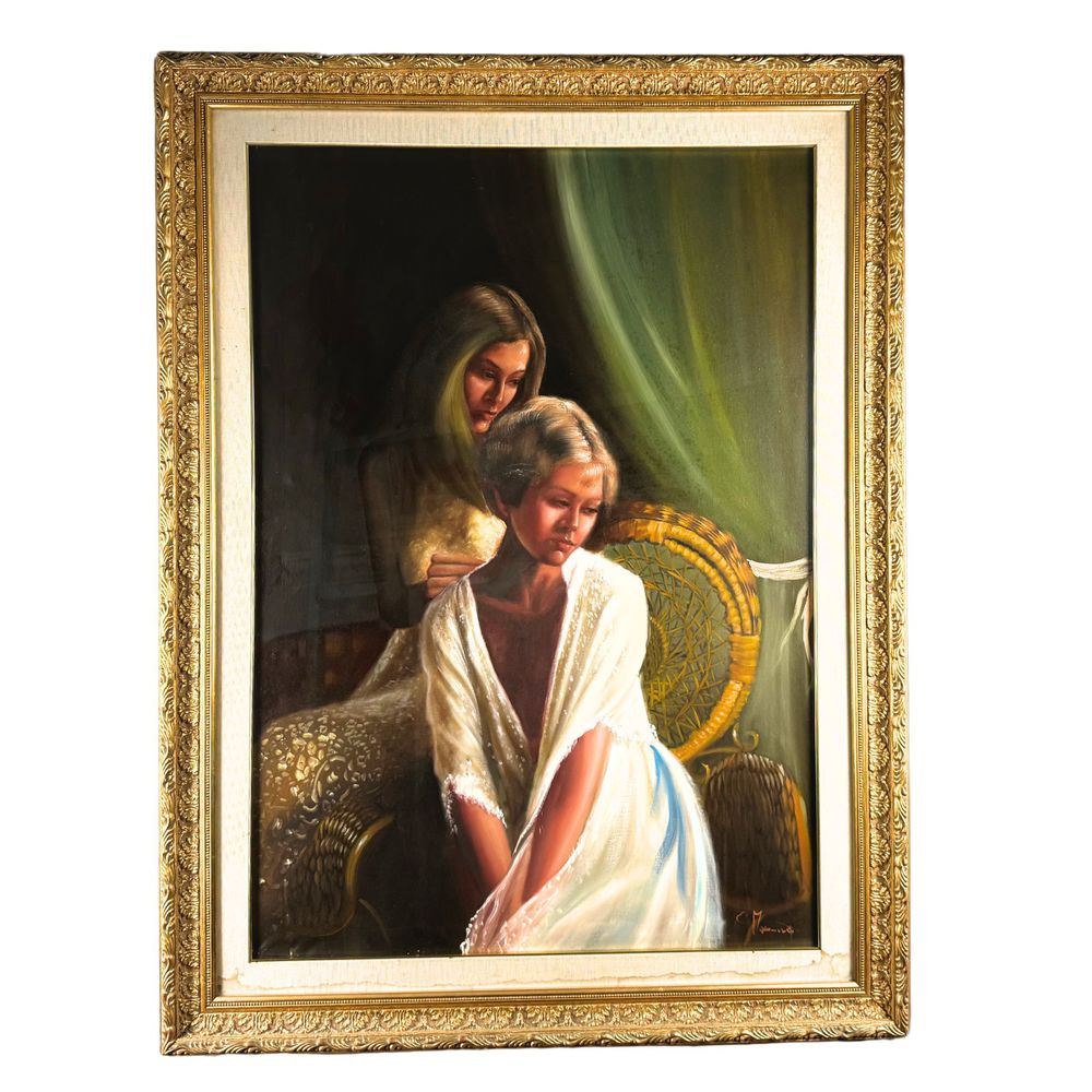 Dipinto olio su tela, periodo XX secolo scuola italiana, raffigurante Ritratto di due donne in un interno. Dimensioni interno cornice: 70x100 cm. Dimensioni compreso cornice: 89x120 cm. Reca firma in basso a sinistra da Moritz (artista non identificato). Opera in buone condizioni.