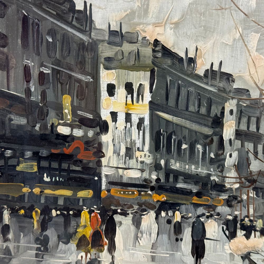 Dipinto olio su tela, periodo XX secolo scuola Italiana, raffigurante Strada con personaggi. Dimensioni interno cornice: 30x40 cm. Dimensioni compreso cornice: 48x38 cm. Reca firma in basso a destra da artista non identificato. Opera in buone condizioni.