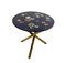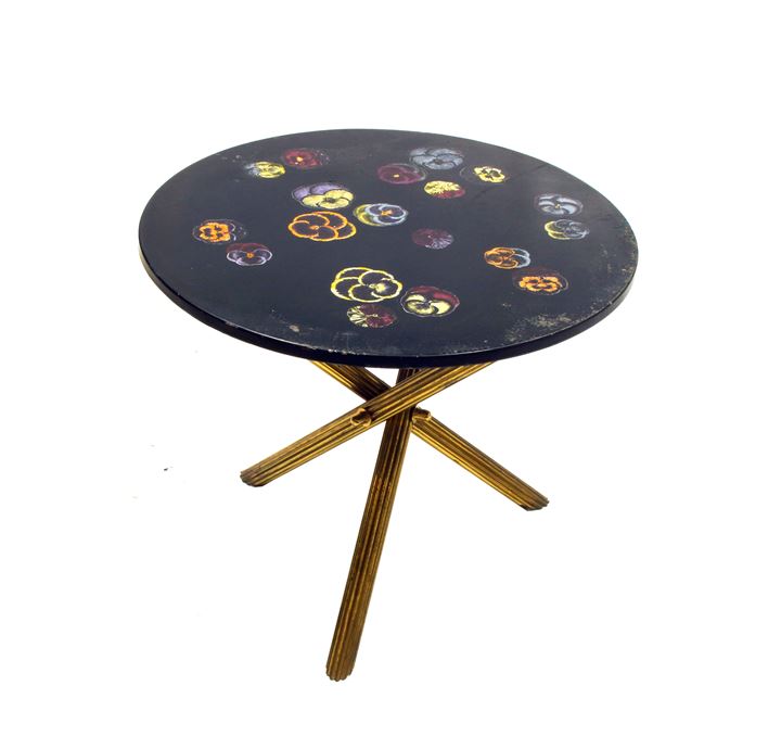 Tavolino con piano in legno laccato e decorato a serigrafia, supporto in ottone.