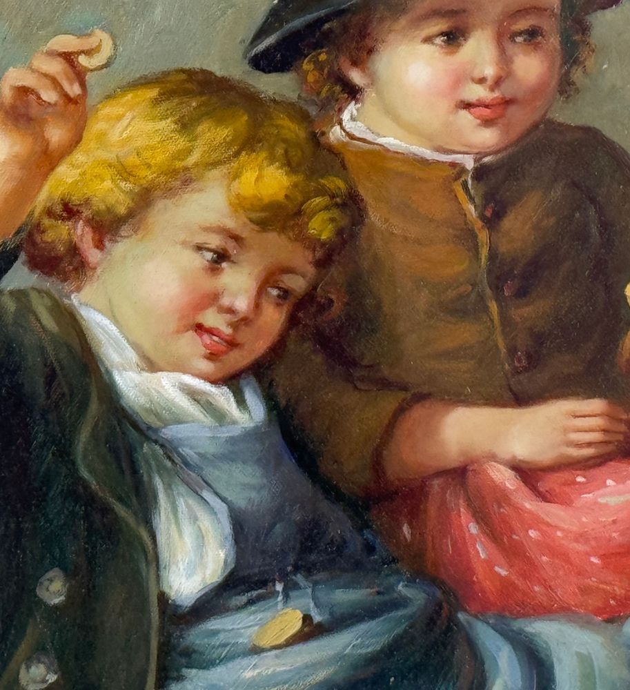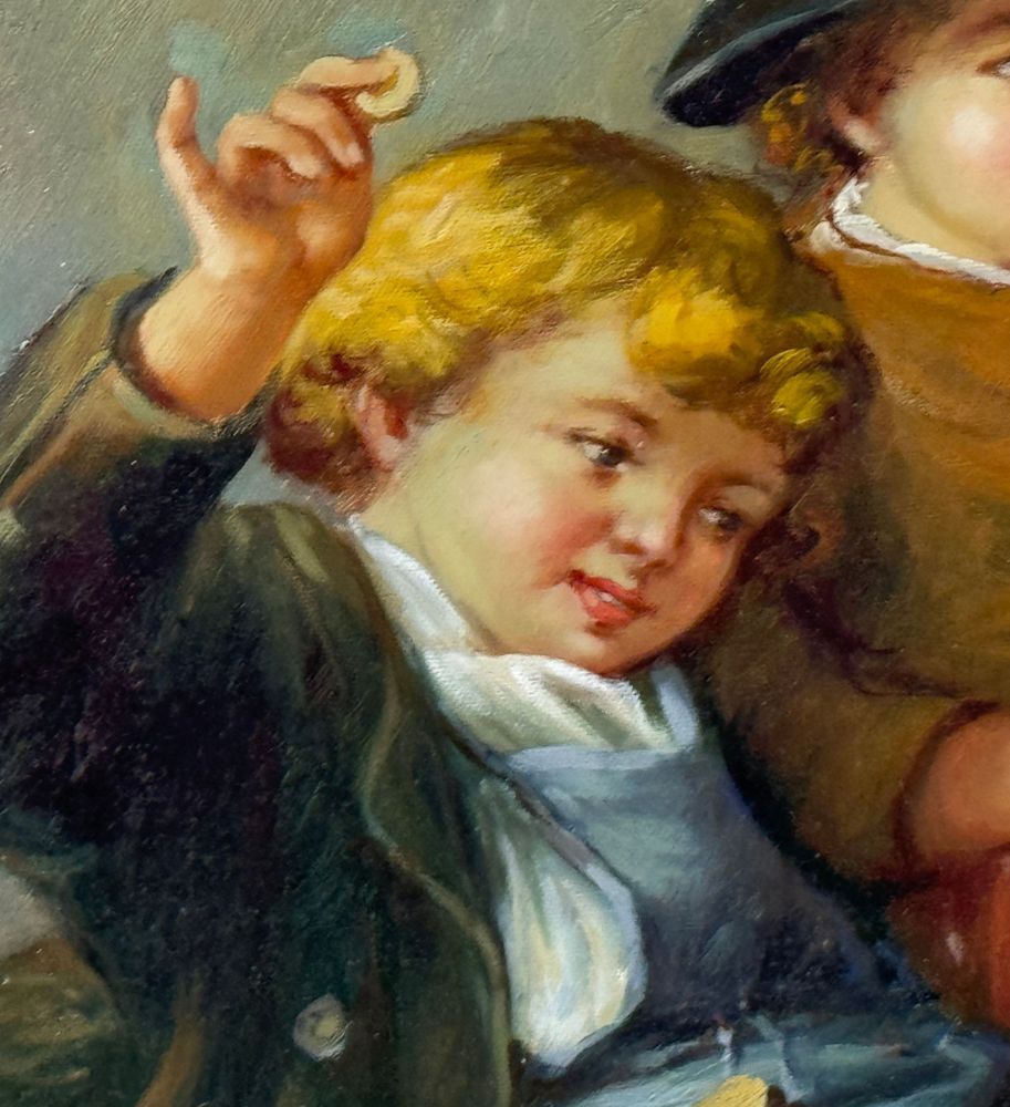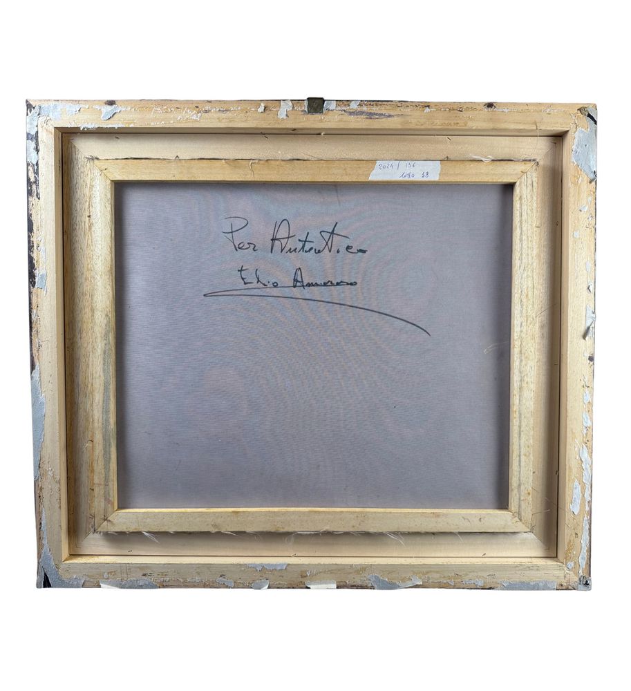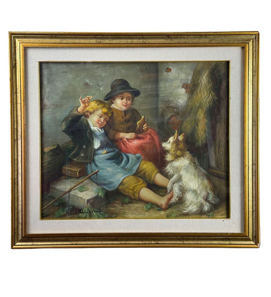Dipinto olio su tela, periodo XX secolo scuola Italiana, raffigurante Giochi di bambini con cane. Dimensioni compreso cornice: 76x66 cm. Dimensioni interno cornice: 60x50 cm. Reca firma in basso a sinistra da Elio Amoroso. Opera in buone condizioni.
