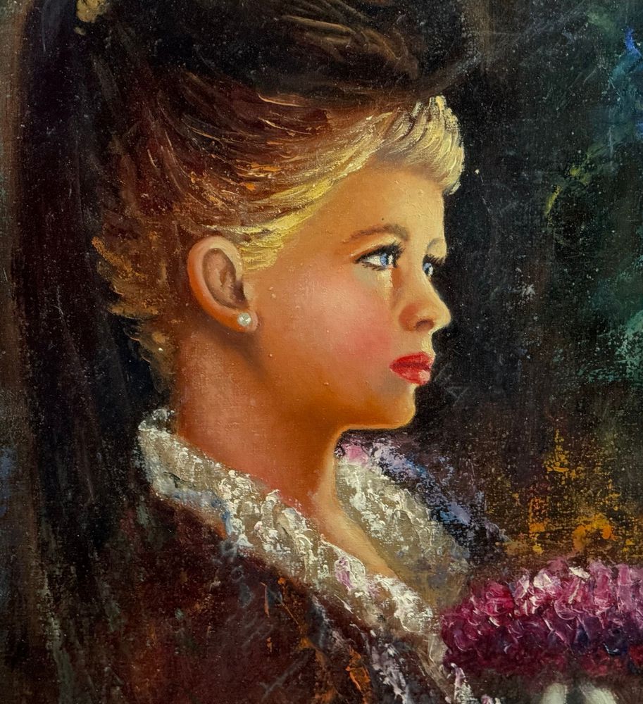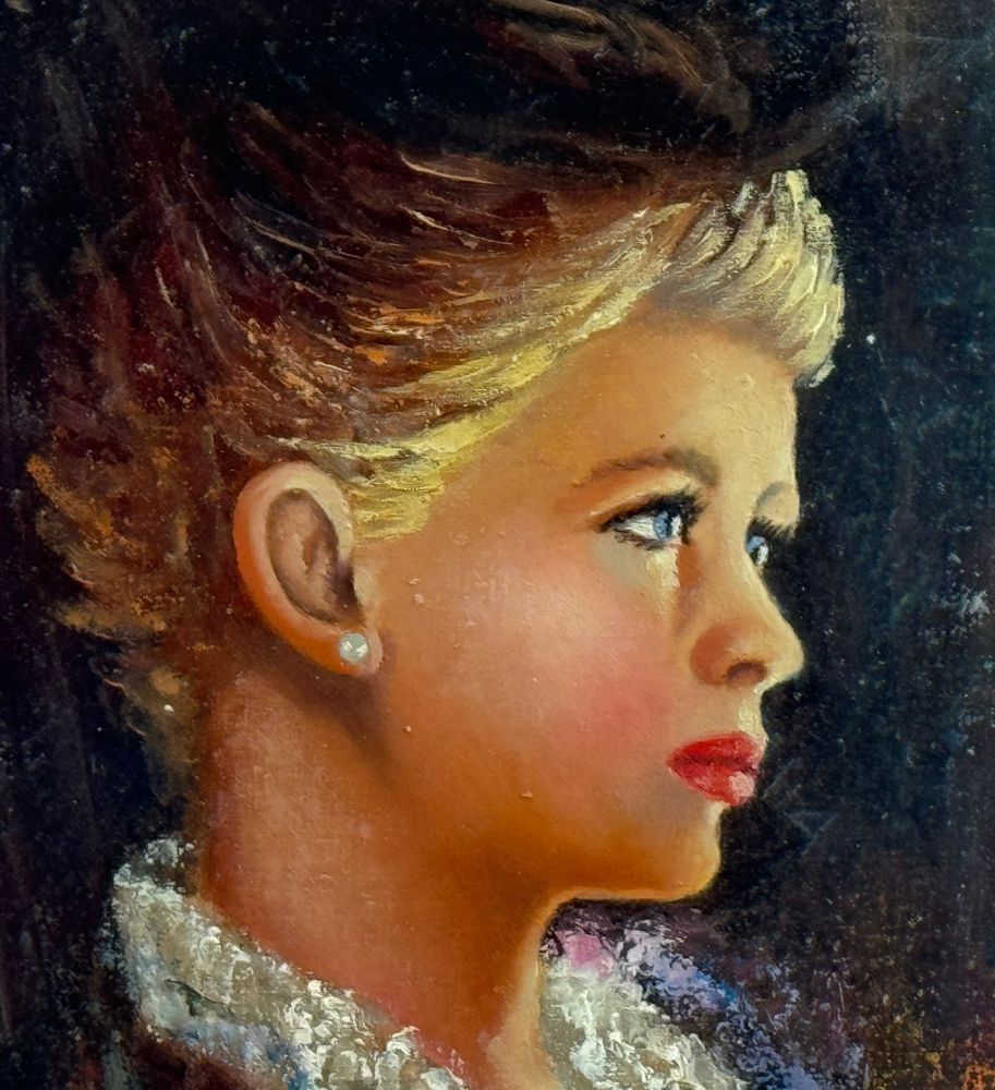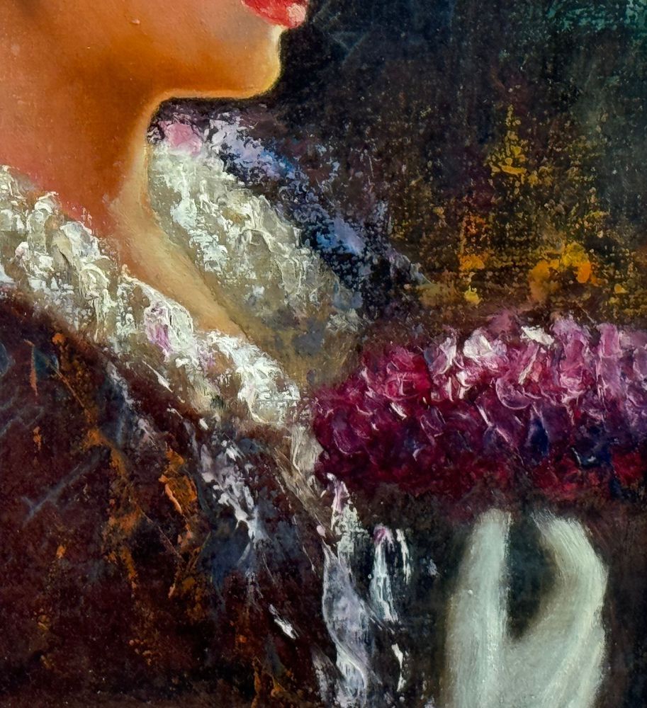 Dipinto olio su tela, periodo XX secolo scuola Italiana, raffigurante Profilo di donna con cappello. Dimensioni compreso cornice: 47x59 cm. Dimensioni interno cornice: 28x41 cm. Reca firma in basso a sinistra da Di Gennaro. Opera in buone condizioni.