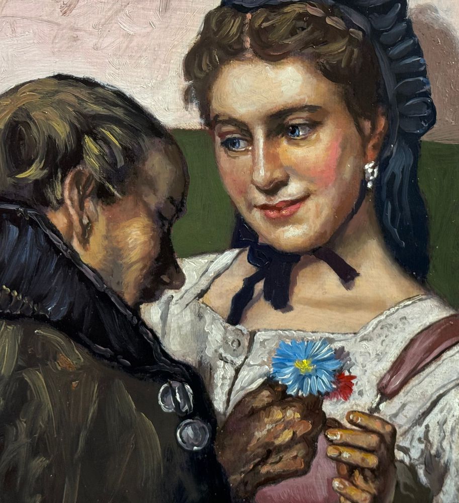 Dipinto olio su tavola, periodo XX secolo scuola italiana, raffigurante Due personaggi. Dimensioni: 40x30 cm. Copia d'autore. Da artista anonimo. Opera in buone condizioni.