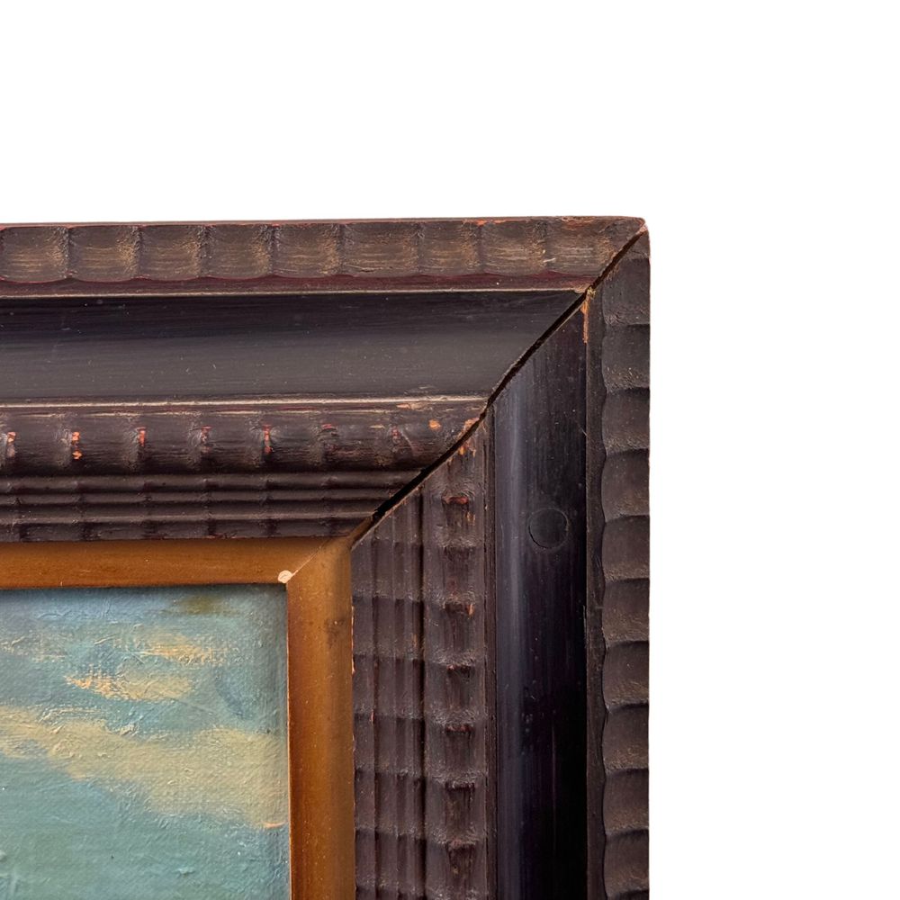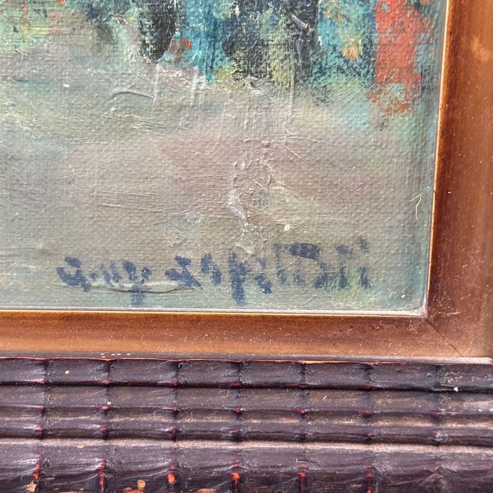 Dipinto olio su tela applicata su cartoncino, periodo XX secolo, raffigurante Personaggi con edificio ed auto d'epoca. Dimensioni interno cornice: 40x31 cm. Dimensioni compreso cornice: 55x45 cm. Reca firma in basso a destra da artista non identificato.