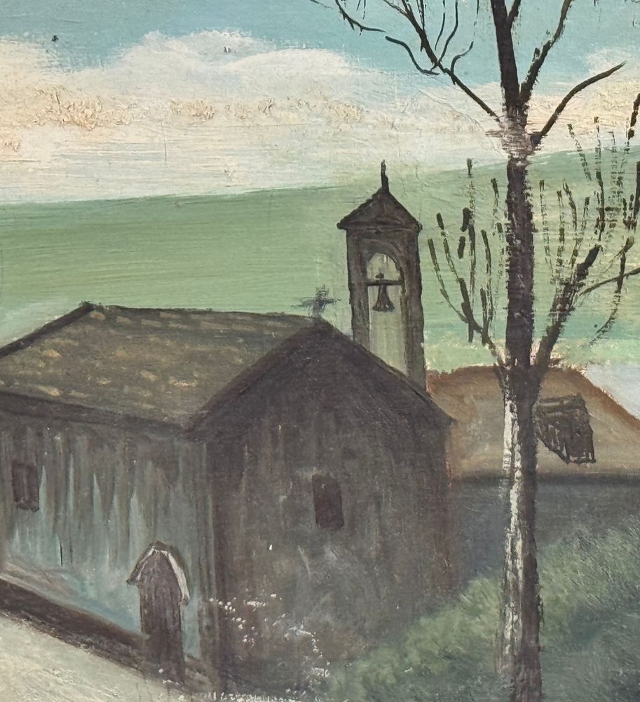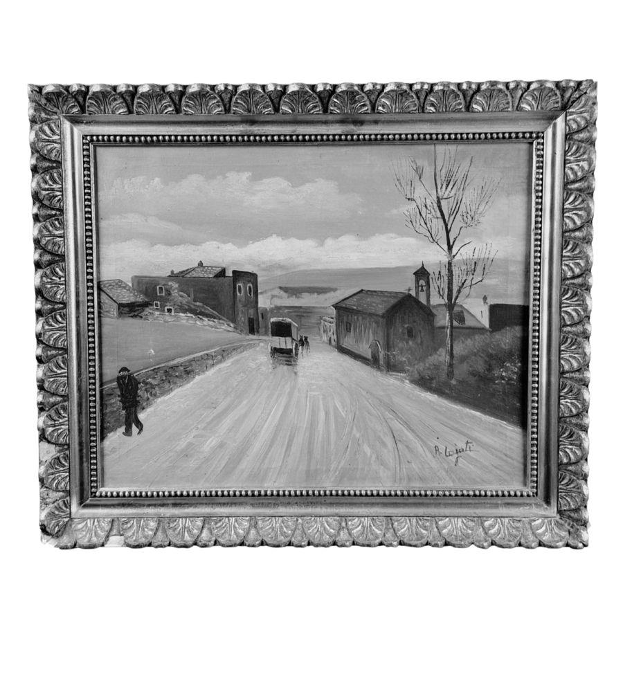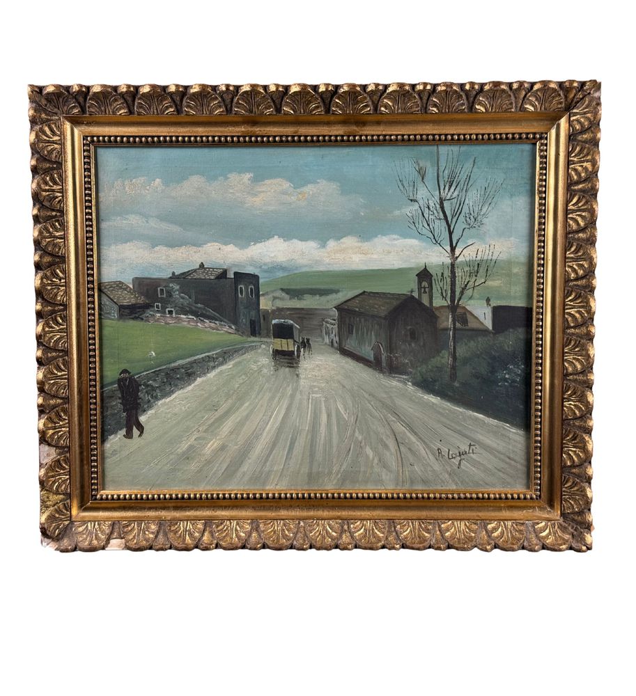 Dipinto olio su tela, periodo XX secolo scuola Italiana, raffigurante Stradina di campagna. Dimensioni compreso cornice: 60x51 cm. Dimensioni interno cornice: 50x40 cm. Reca firma in basso a destra da artista non identificato. Opera in buone condizioni.