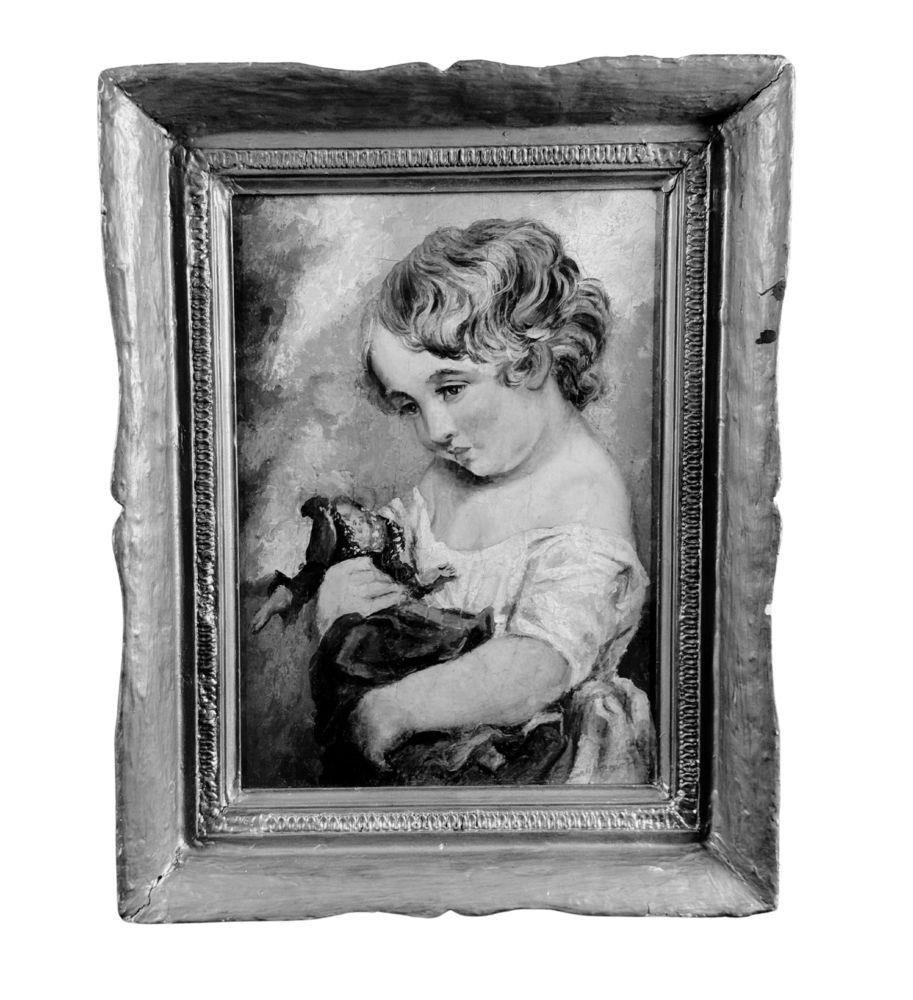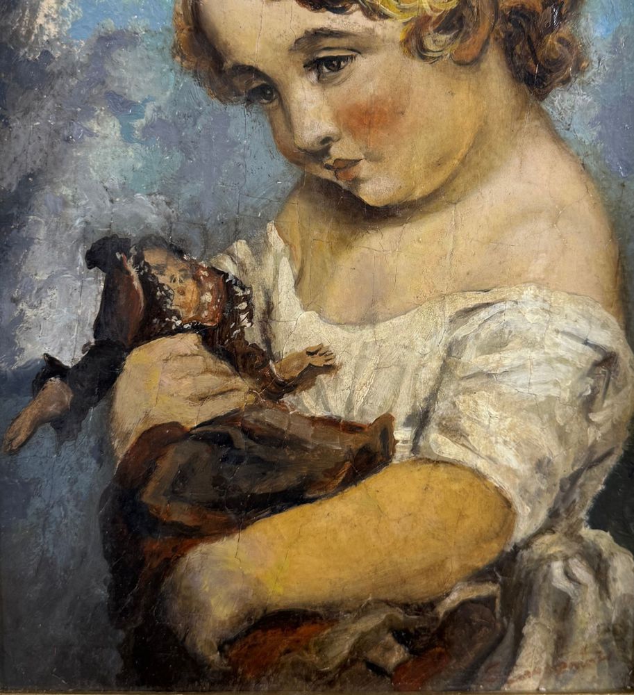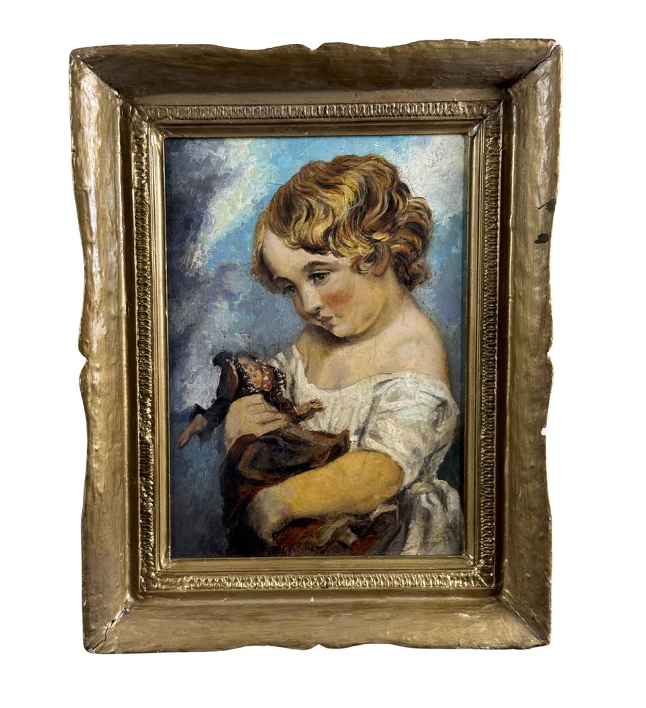 Dipinto olio su tela, periodo XIX/XX secolo scuola Italiana, raffigurante Ritratto di bambina con bambola. Dimensioni compreso cornice: 37x46 cm. Dimensioni interno cornice: 27x37 cm. Reca firma in basso a destra da artista non identificato. Opera in buone condizioni, da segnalare un vecchio rintelo.