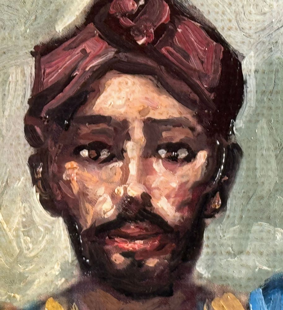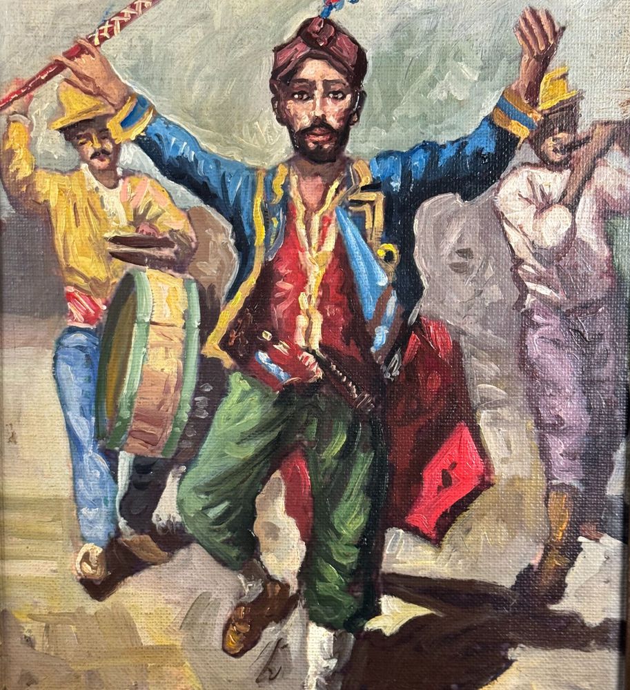 Dipinto olio su tela applicata su pannello, periodo XX secolo scuola italiana, raffigurante Artista di strada. Dimensioni compreso cornice: 62x72 cm. Dimensioni interno cornice: 40x50 cm. Reca firma in basso a destra da artista non identificato. Opera in buone condizioni.