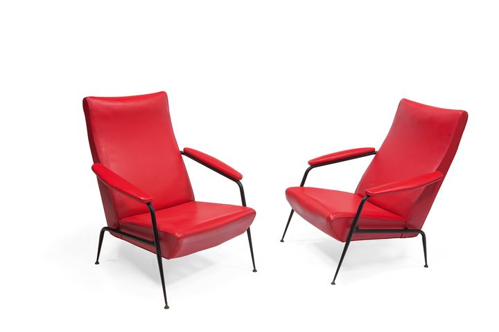 PRODUZIONE ITALIANA Coppia di poltrone in tondino verniciato e ottone, seduta...