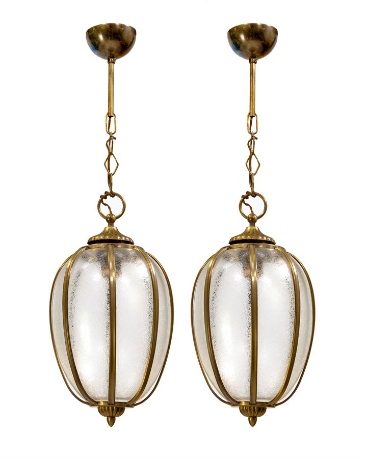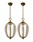 Coppia di lampade a sospensione con struttura in ottone e vetro corroso.