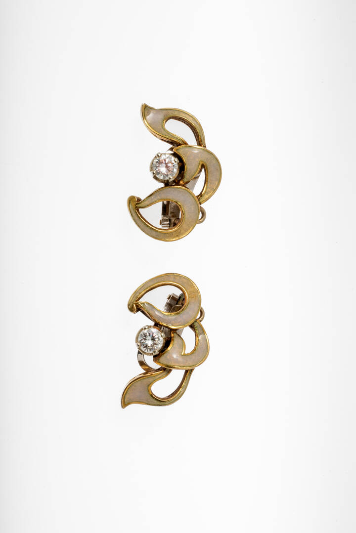 Coppia di orecchini in oro giallo e bianco, a clip, con smalto traslucido e due diamanti taglio brillante per totali ct 0,50 ca. Firmati "Cirio e Bonisoli".