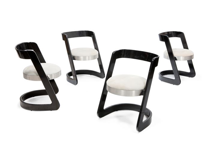 RIZZO WILLY Quattro sedie in legno laccato e seduta in acciaio spazzolato e...