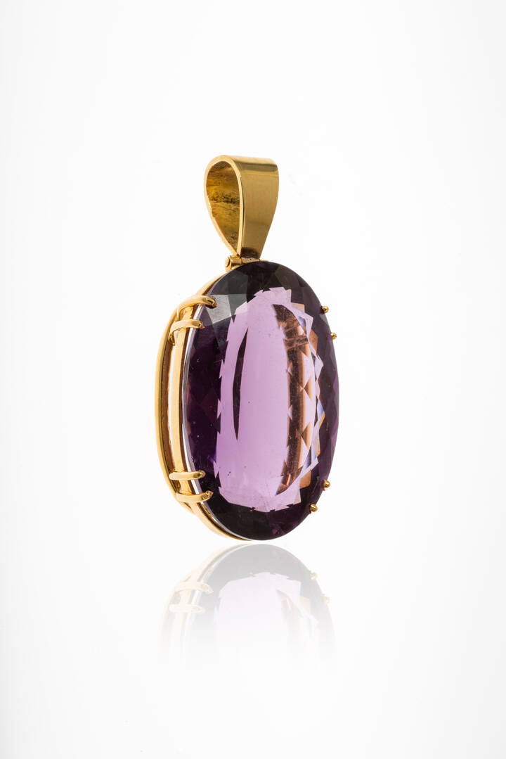 Previous Lot 85 Next Sant’Agostino - Corso Tassoni 56, 10144 Torino Asta 259-Gioielli Sessione unica Thursday 3 April 2025 hours 16:00 (UTC +01:00) CIONDOLO CIONDOLOPeso gr 19,9Cm 4,5x2in oro giallo con grande ametista di 54 Kt.