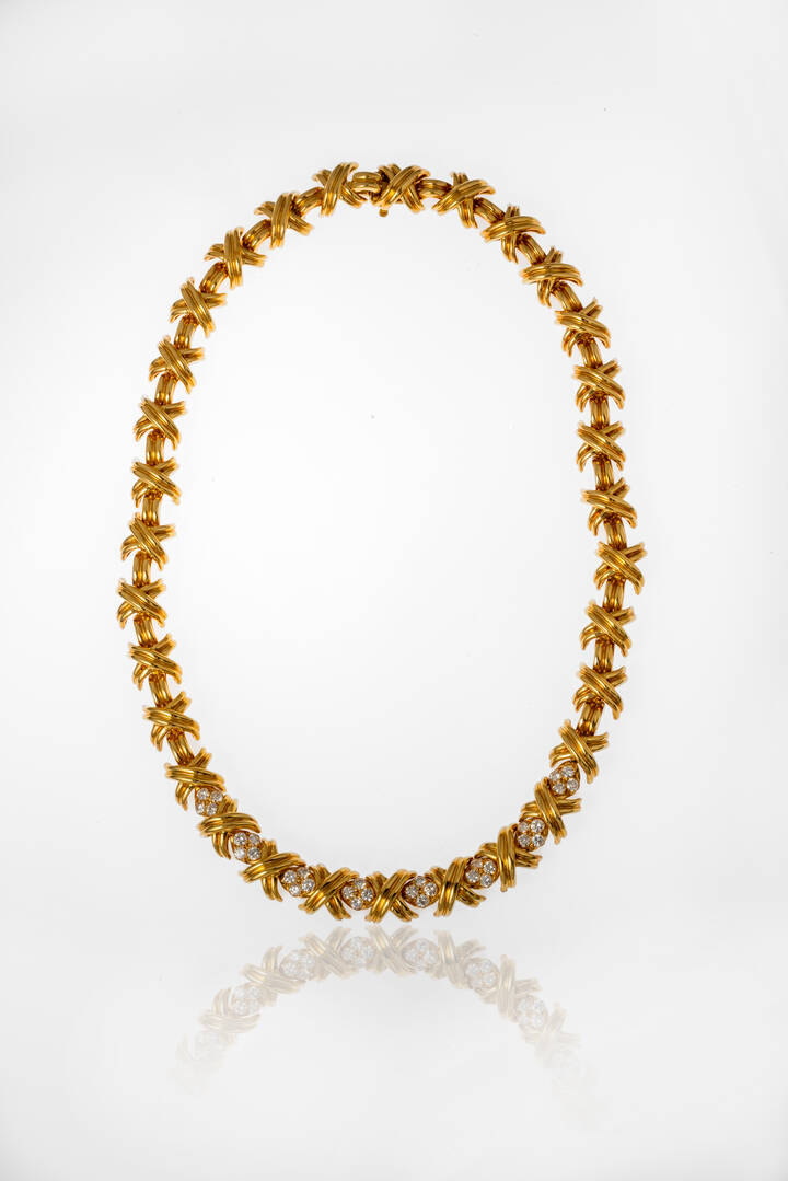 Girocollo in oro giallo, firmato "Tiffany & Co", modello "Signature X", con diamanti taglio brillante per totali ct 1,60 ca, probabile colore F-G, purezza VVS