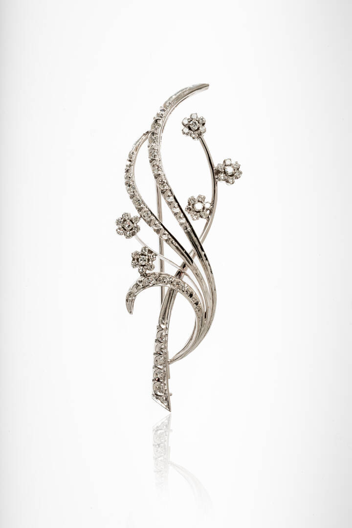 in oro bianco, a forma di ramo fiorito, anni '50, con piccoli diamanti taglio 8/8 per totali ct 0,30 ca