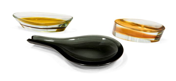 Tre svuotatasche in lastre di cristallo colorato incollate e scolpite alla mola.