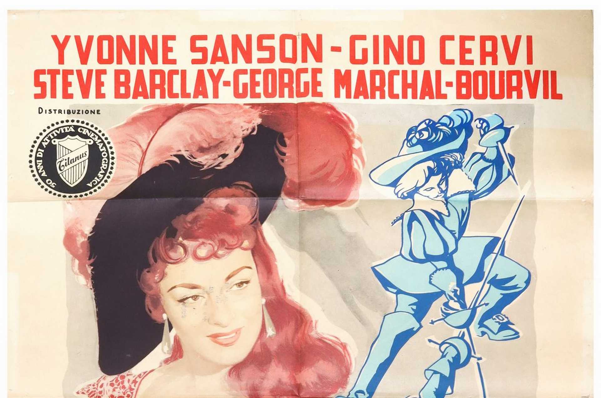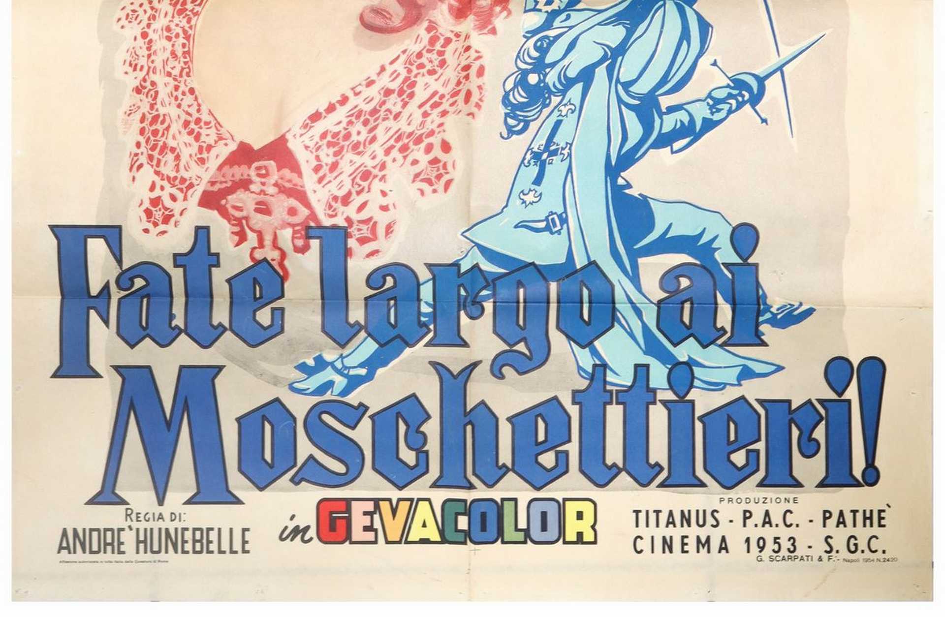 Manifesto cinema due fogli ''Fate largo ai moschettieri!'', 1954 cm 140x100 Prima edizione, G.Scarpati & F. - Napoli, normali segni d'uso, presenti buchi e segni d'inchiostroPrima edizione, G.Scarpati & F. - Napoli, normali segni d'uso, presenti buchi e segni d'inchiostro