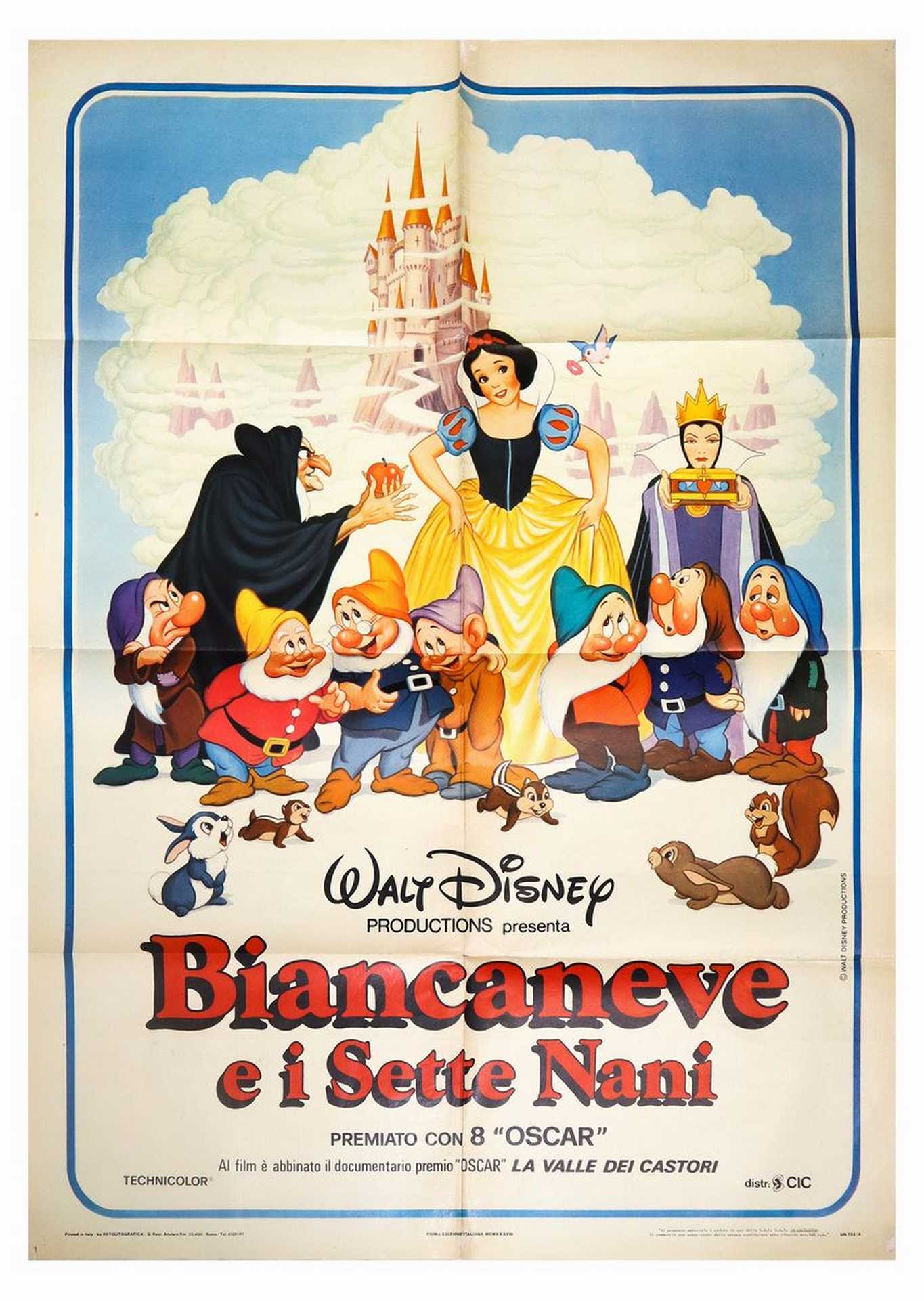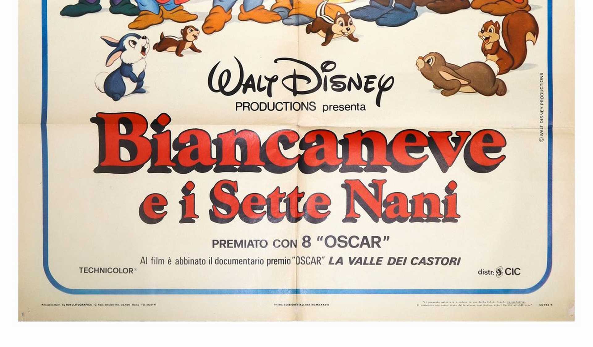 Manifesto cinema due fogli ''Biancaneve e i sette nani'', 1938 cm 140x100 Seconda edizione, printed in Italy by Rotolitografica - Roma, normali segni d'uso, presente nastro sul retroSeconda edizione, printed in Italy by Rotolitografica - Roma, normali segni d'uso, presente nastro sul retro