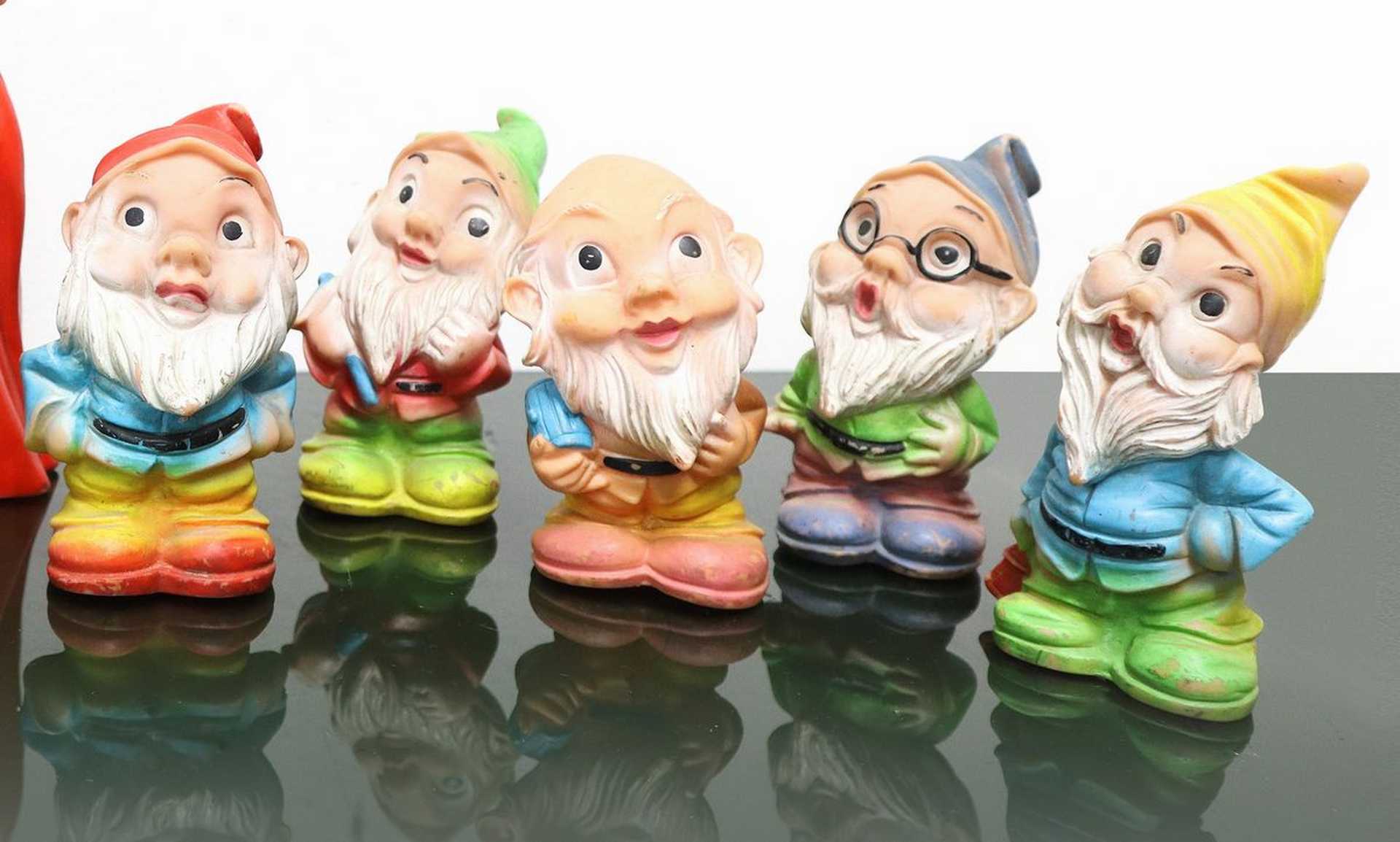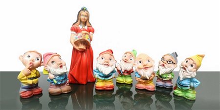 Rubber Toys - Biancaneve e i sette nani, 1960 h cm 14 / h cm 27 Pupazzi in gomma con sonaglio made in Italy, collezione completa. Presenti normali segni d'uso e piccole mancanze di colore.Pupazzi in gomma con sonaglio made in Italy, collezione completa. Presenti normali segni d'uso e piccole mancanze di colore.