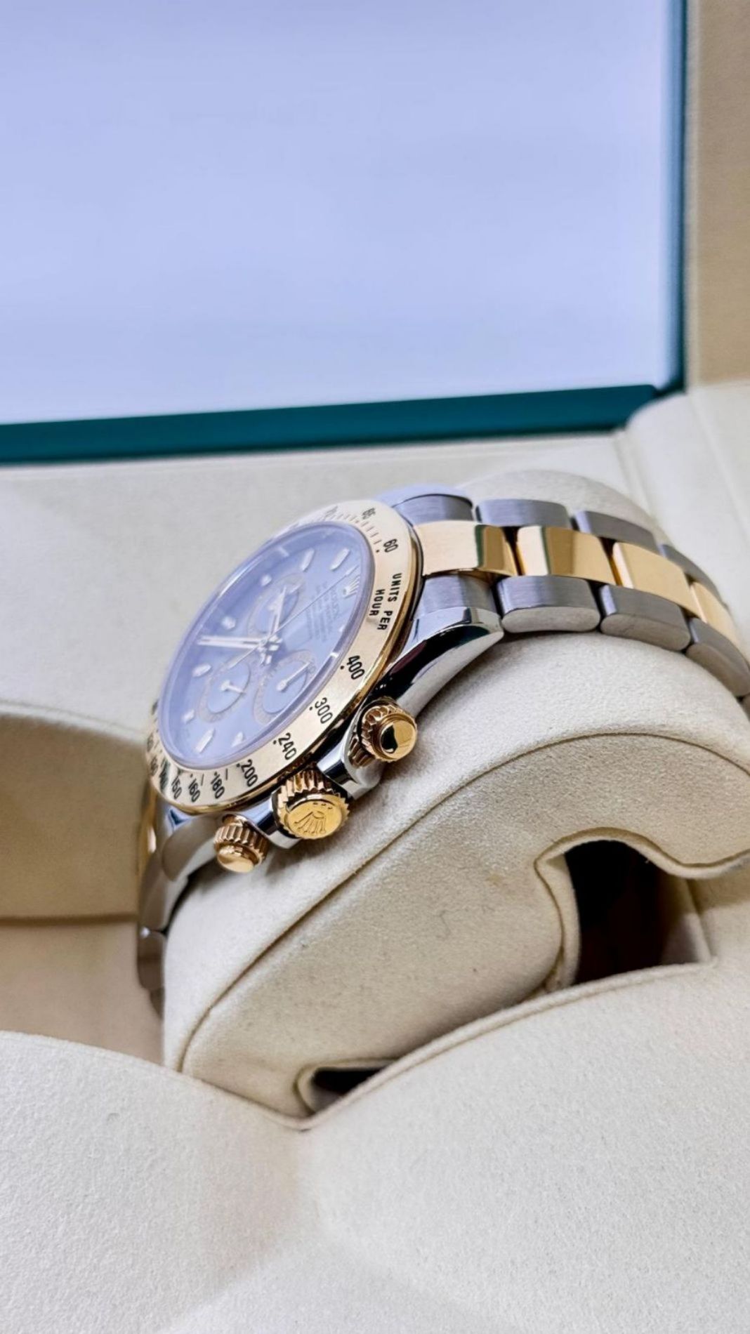 Marca Rolex Modello (Orologio) Daytona Numero di referenza 116523 Carica Automatico Materiale della cassa Oro/Acciaio Materiale cinturino Oro/acciaio Anno 2010 documenti originali Rolex, no box, la scatola viene utilizzata solo per fotografie non è in vendita Calibro Carica Automatico Cassa Materiale della cassa Oro/Acciaio Diametro 40 mm Impermeabile 10 ATM Materiale lunetta Oro giallo Vetro Vetro zaffiro Cinturino Materiale cinturino Oro/acciaio Colore cinturino Oro/acciaio Chiusura Déployante Materiale chiusura Oro/Acciaio Funzioni Cronografo
